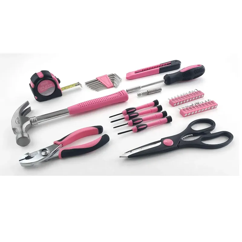 Este conjunto de ferramentas rosa contém as ferramentas necessárias para a maioria dos consertos domésticos.