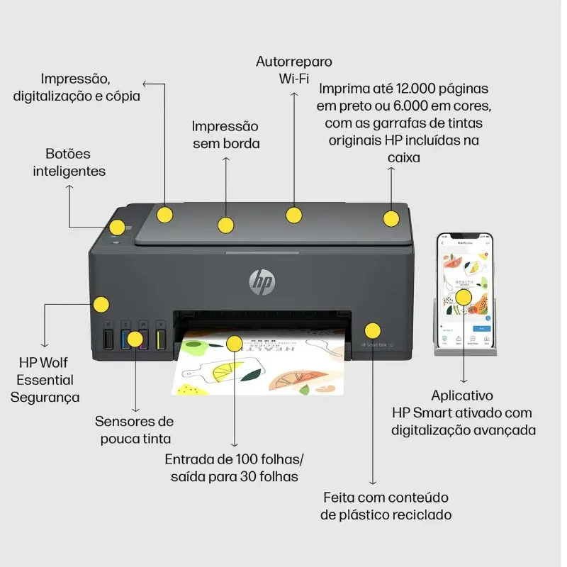 Quer mais praticidade pra cuidar dos seus documentos em casa ou no escritório? Então olha só essa Impressora da HP. Essa é uma Multifuncional que faz parte da Linha Colorida. Tudo isso porque esse modelo HP Tank 581 imprime tanto na cor Preto quanto Colorido, sabia? Pois é. Essa é uma impressora do tipo Multifuncional Tanque de Tinta. Com ela você vai poder imprimir os arquivos que precisar e o melhor, com nitidez e cores vivas. E já que estamos falando de uma impressora multifuncional, ela tem capacidade de Impressão, digitalização, cópia, e comandos sem fio. Sem falar que ela possui conexão 1 USB e conectividade 1 USB 2.0 de alta velocidade (dispositivo); 1 Bluetooth Low Energy; 1 Wi-Fi 802.11b/g/n; 1 Wi-Fi Direct. Que vai deixar sua rotina mais prática e rápida com documentos e arquivos.