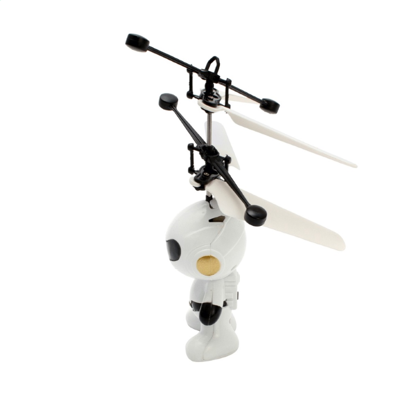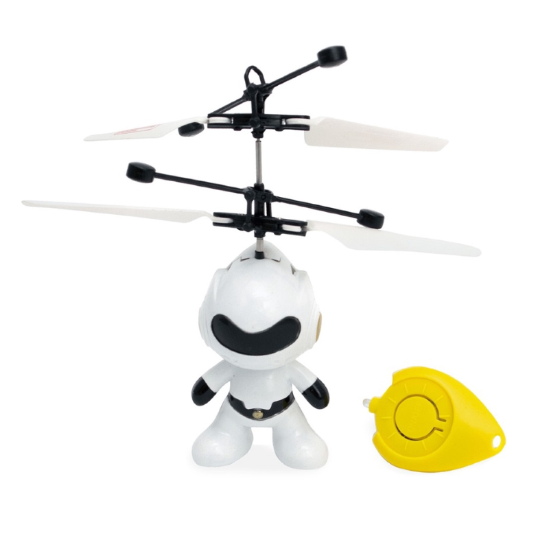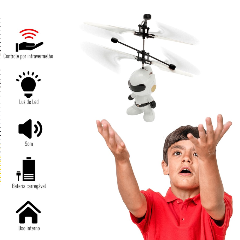 Um robô voador com tecnologia de ponta, sensor infravermelho de LED, sensível aos movimentos próximos, com design divertido e moderno em forma de robô. A brincadeira começa quando as hélices giram, basta guiar com as mãos.