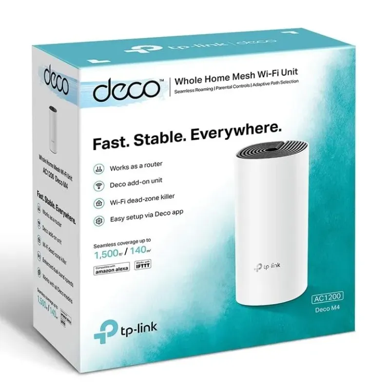 Tenha a melhor experiência Wi-Fi O Deco M4 cobre uma área de até 185m² (1 unidade) e é a maneira mais simples de garantir um forte sinal Wi-Fi em todos os cantos da sua casa! As conexões sem fio de 2.4 GHz e 5 GHz trabalham juntas para fornecer velocidades de rede ainda mais rápidas e cobertura realmente perfeita. Quer mais cobertura? Basta adicionar mais Decos. O Deco M4 usa a tecnologia TP-Link Mesh para cobrir toda a sua casa e eliminar áreas de sombra de Wi-Fi. Várias unidades funcionam perfeitamente em conjunto para criar uma rede.