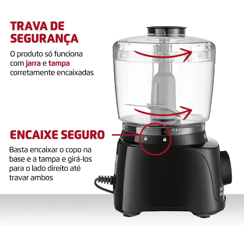 TRAVA DE SEGURANÇA: O produto só funciona com jarra e tampa corretamente encaixados. O travamento é pela lateral: basta encaixar o copo na base e girá-lo para o lado direito.