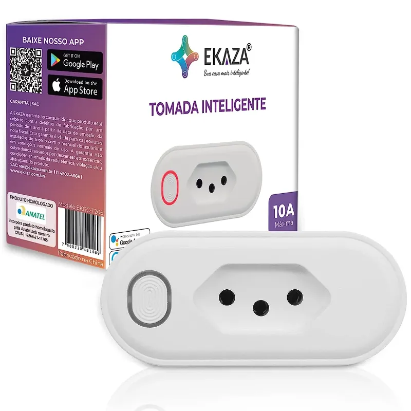 Com a tomada inteligente você automatiza os seus aparelhos eletrônicos e monitora em tempo real os gastos de energia, trazendo assim uma economia de energia ainda maior para a sua casa. Ela é de fácil instalação e pode ser realizada pelo próprio usuário. Aproveite para programar o melhor horário para ligar automaticamente os seus aparelhos eletrônicos. Adquira a sua e descubra todos os recursos desse item multifuncional! Compativel com Alexa, Google Assistant. Somente Wi-Fi de 2,4 GHz (não suporta Wi-Fi de 5 G GHz), suporta Android 4.4 e IOS 8 ou superior. Realiza experiência de controle de voz, obviamente aprimora sua experiência de casa inteligente. Características: - Compatível com rede Wi-fi 2.4Ghz (Observação: Não funciona com rede 5Ghz); - Acompanha manual de instalação; - Aplicativo EKAZA para controlar o seu alimentador disponível para download para Android e iOS (apple); Funções: - Ligar e Desligar no APP Ekaza; - Programação de Horário; Descrição técnica do produto: Modelo: [EKGC-T206], Corrente máxima: 10a Carga resistiva @110V, 10A@220V Potência máxima:1600w Tensão: 100-240Vca, 50/60Hz Conexão Wi-Fi: IEEE 802.11b/g/n, 2.4GHz Plug: Brasil (NBR 14136), Certificações: Anatel, RoHS App: EKAZA Anatel: CB2S | 17869-21-11765 EAN:7908228401469