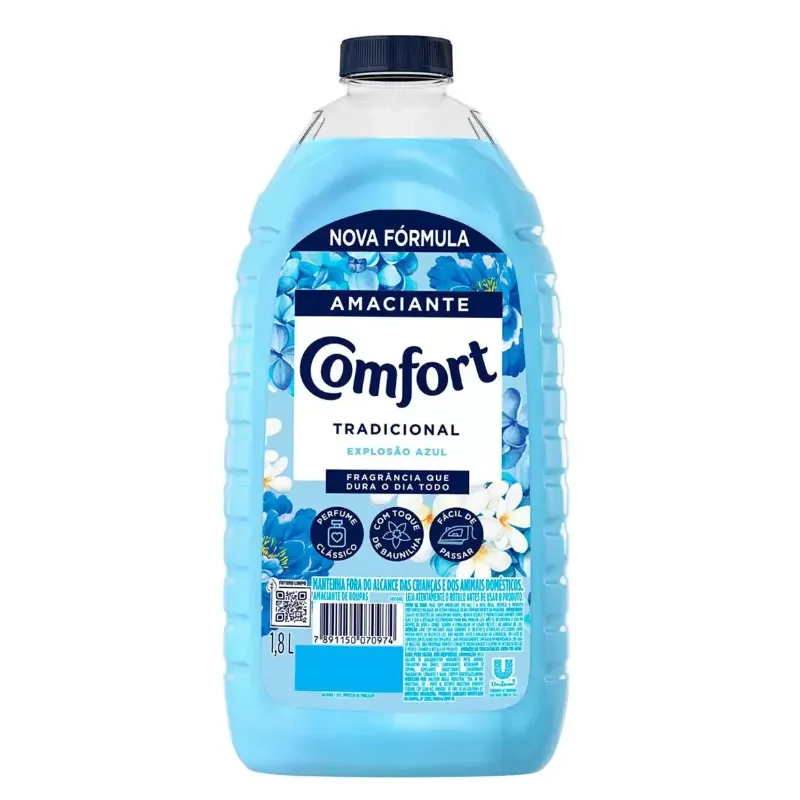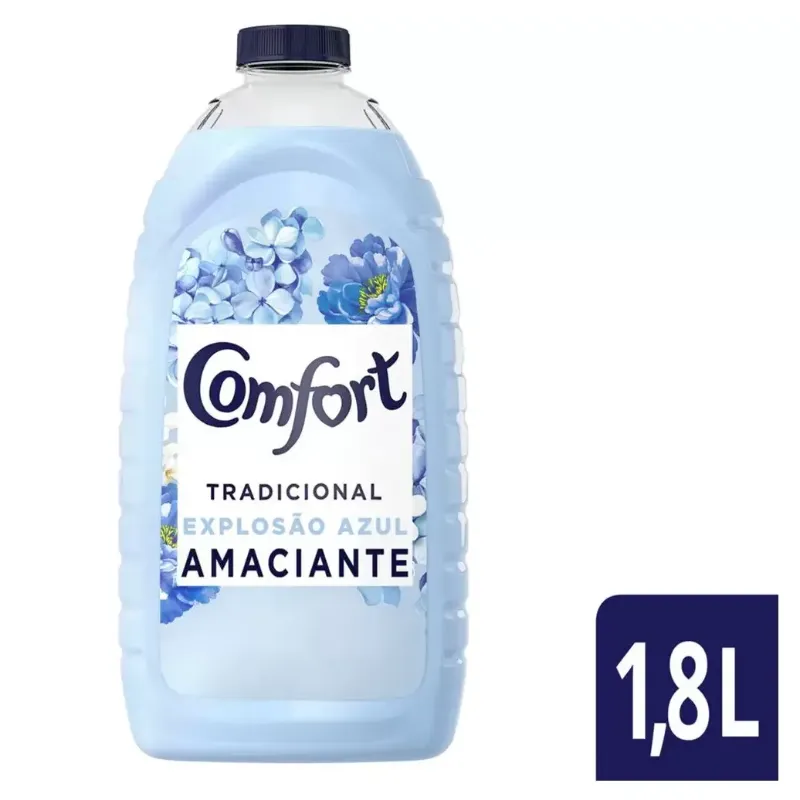 O Amaciante Diluído Comfort Explosão Azul possui fragrância que dura o dia todo e perfume clássico com um toque de baunilha Esse amaciante Comfort protege as roupas dos danos da lavagem, mantém a cor e o brilho e previne o desgaste às fibras O Amaciante Diluído Comfort Explosão Azul mantém as suas roupas com cara de novas mesmo após 20 lavagens O amaciante de roupa Comfort possui fragrância e frescor mais duradouros A garrafa dos nossos amaciantes é feita com 50% de plástico reciclado. E, além disso, é 100% reciclável O Amaciante Diluído Comfort Explosão Azul vem numa embalagem azul nos formatos de 1,8 L e 3 L O Amaciante Diluído Comfort Explosão Azul foi pensado especialmente para deixar as suas roupas macias, com perfume inesquecível e prolongado. A sua nova fórmula contém cápsulas de perfume que deixam as roupas com cheirinho de lavadas durante o dia todo. É a fragrância tradicional de Comfort que você já conhece, agora com toque de baunilha e perfume mais duradouro para as suas roupas. O Amaciante Diluído Comfort Tradicional Explosão Azul tem o perfume clássico de Comfort e garante maciez para as roupas de toda a família, deixando-as mais leves e confortáveis de usar. Ele protege as roupas dos danos da lavagem, mantém a cor e o brilho e previne o dano às fibras. O uso do amaciante de roupas Comfort diluído deixa as suas peças mais macias, fáceis de passar e perfumadas. Usar o amaciante Comfort na hora de lavar suas roupas é muito simples: consulte a quantidade recomendada na embalagem e, dosando o amaciante conforme indicado, despeje a quantidade de produto dentro do compartimento de sua máquina de lavar. Em seguida, escolha o ciclo de lavagem desejado. Se preferir, o Amaciante Diluído Comfort Tradicional Explosão Azul também pode ser usado na lavagem das suas roupas no tanque. A garrafa dos nossos amaciantes Comfort é feita com 50% de plástico reciclado. E, além disso, é 100% reciclável.