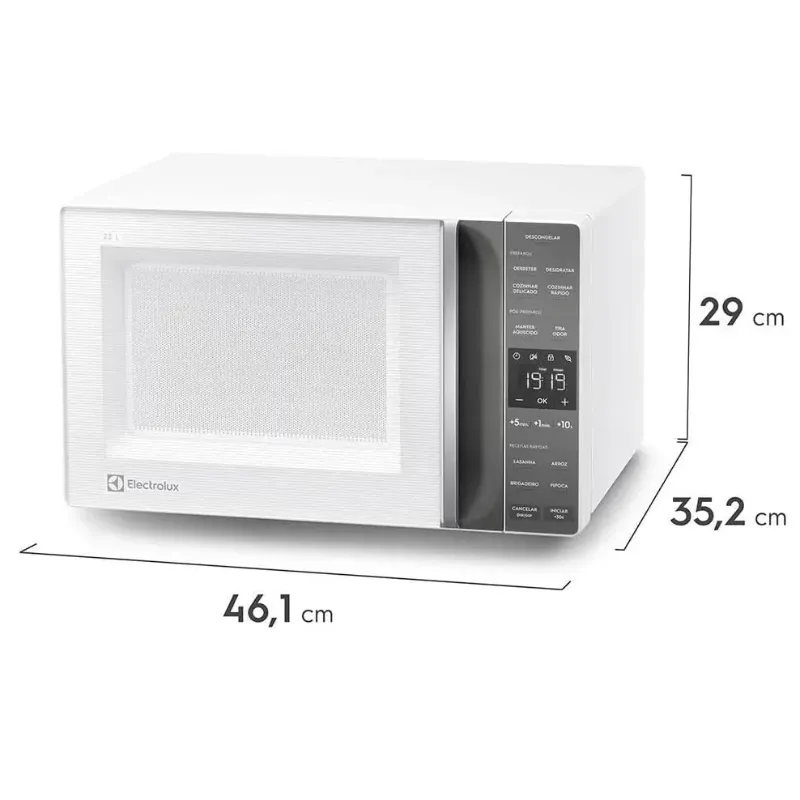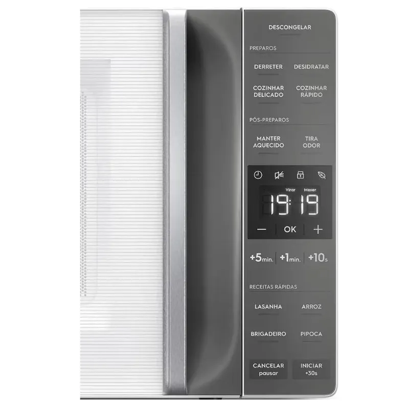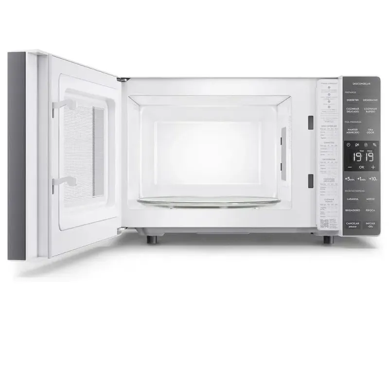 O inovador painel inteligente oferece 4 funções diferentes para facilitar os preparos de seu dia a dia. Experimente fermentar, desidratar, derreter, cozinhar delicado e cozinhar rápido com apenas um toque: Derreter: Alimentos derretidos no ponto certo. Ideal para manteiga e chocolate. Desidratar: Faça chips de vegetais e frutas ou desidrate ervas para conservá las. Cozinhar Delicado: Para alimentos que necessitam de cozimento suave, como vegetais macios e peixes. Cozinhar Rápido: Oferece agilidade no preparo de alimentos firmes, como carne bovina e legumes como batata. Descongelamento Assistido: Indica, por meio de um aviso sonoro e luminoso, o momento certo de virar ou mexer os alimentos, garantindo um resultado mais uniforme Função Manter Aquecido: Garante que seu prato fique aquecido até a hora do consumo para você aproveitar o melhor de cada refeição. Função Tira Odor: O sistema de recirculação do ar interior suaviza os odores deixados por preparos anteriores e mantém o micro ondas sempre pronto para a próxima receita. Quatro Receitas Pré Programadas: Oferece a facilidade que sua rotina merece. Com apenas um toque, faça pratos conhecidos: lasanha, arroz, brigadeiro e pipoca. Função Economia de Energia: Desliga as luzes do painel quando o micro ondas não está em uso. Oferece classificação energética A, sendo econômico para o dia a dia 1 ano de garantia Função Trava Painel: Garante que o painel não seja acionado ou alterado indevidamente por crianças, por exemplo, e impede que os comandos sejam acionados durante a limpeza do painel. Função Mudo: Configure seu micro ondas para não emitir som durante o uso e mantenha o ambiente silencioso sempre que quiser. Função Limpa Fácil: Facilita a remoção de gorduras e respingos provocadas pelo uso. QR Code: Você pode acessar mais detalhes sobre os benefícios do seu produto na palma de sua mão. 1100W para suas receitas: Potência ideal para diversos tipos de preparos