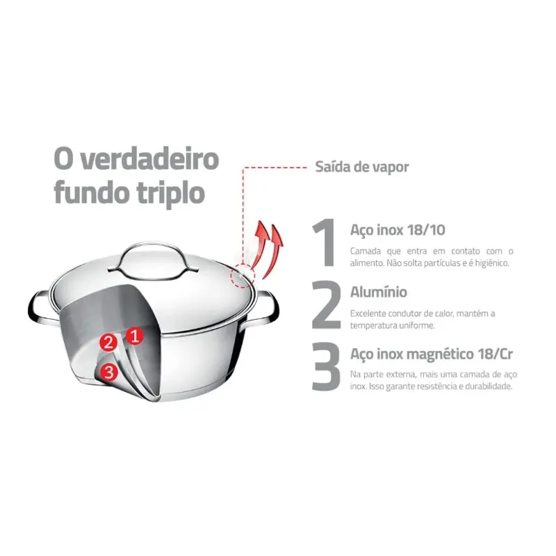 O design clean da linha Allegra foi criado para tornar mais simples as tarefas de forno e fogão. Totalmente feitas em aço inox, por isso não solta nenhum resíduo nos alimentos, mantendo-os saudáveis. Altamente durável, mantém as características originais, preservando a beleza, a higiene e a durabilidade do material. O fundo triplo (aço inox + alumínio + aço inox) distribui o calor uniformemente, proporcionando um cozimento mais rápido e uniforme, economizando energia e deixando os alimentos aquecidos por mais tempo. Podem IR ao forno para gratinar ou finalizar pratos, na temperatura máxima de 260°C. Possui design diferenciado e moderno, com acabamento em alto brilho. Desenho limpo e sem cantos torna a limpeza mais fácil. Tampa com saída de vapor e encaixe perfeito. Podem ser lavadas diariamente na máquina de lavar louças. As panelas podem ser utilizadas nos fogões: gás, elétrico, vitrocermico e indução.