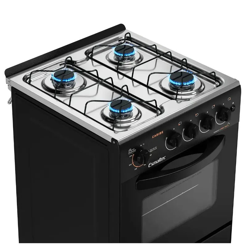 Se você tá procurando por um fogão novo pra sua cozinha, dá uma olhada nessa opção. Esse Fogão a Gás 4 bocas da Esmaltec. Ele é um fogão de Piso com design em vidro temperado moderno que valoriza sua cozinha e deixa a limpeza fácil, tornando o preparo das receitas preferidas da sua família ainda melhor. O fogão CARIBE tem 4 bocas e é na cor Preto, tem acendimento automático e painel. O Forno Simples possui boa capacidade interna, são 53,2 litros. Sem falar nos 1 queimador família 2,0kW e 3 queimadores pequenos 1,7kW, forno limpa fácil, novas trempes e pés altos e com novo design, que fica mais fácil atá na hora de fazer a limpeza.