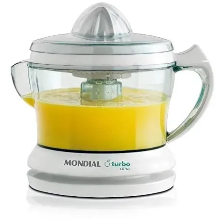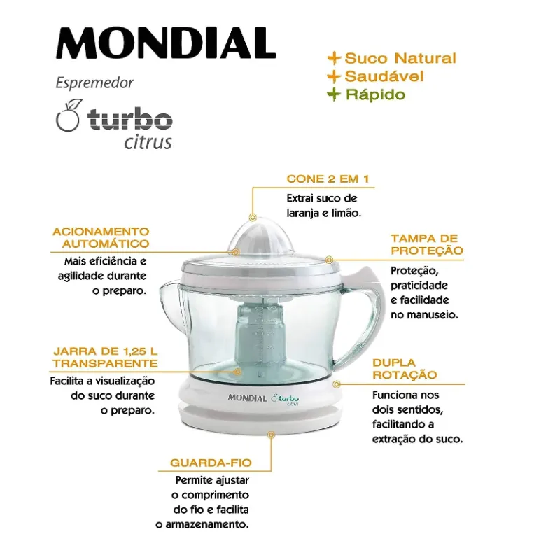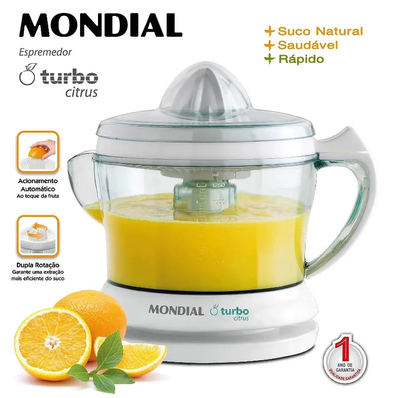 O Espremedor Turbo Citrus E-01 tem CONE 2 EM 1, podendo espremer LARANJA E LIMÃO. Ele não precisa de botão, FUNCIONANDO AO TOQUE DA FRUTA, e GIRA NOS 2 SENTIDOS. Com sua JARRA DE 1,25L, SERVE ATÉ 4 PESSOAS. Se você estava procurando seu primeiro espremedor, você encontrou! Este ESPREMEDOR DE FRUTAS é SIMPLES, PRÁTICO, EFICIENTE, FÁCIL DE LIMPAR, e tem um ÓTIMO CUSTO-BENEFÍCIO. Sua DUPLA ROTAÇÃO faz com que ele extraia o máximo de suco da fruta. Como a jarra é TRANSPARENTE, você pode ver o suco durante o preparo. E a TAMPA DE PROTEÇÃO faz com que A JARRA POSSA SER POSTA À MESA na hora de servir. Seu GUARDA-FIO deixa você AJUSTAR O COMPRIMENTO do fio e faz este espremedor ser MAIS FÁCIL DE GUARDAR. O Espremedor Turbo Citrus E01 foi desenvolvido PARA USO DOMÉSTICO, sendo melhor para uso residencial. Tudo isso com 1 ANO DE GARANTIA MONDIAL. A Mondial é a escolha de milhões de consumidores.