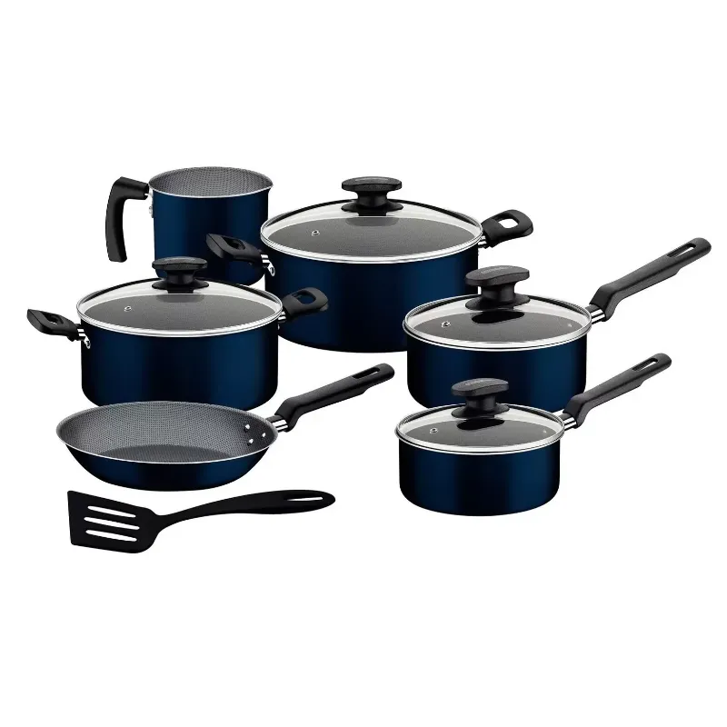 O Jogo de Panelas Ravena da Tramontina é ideal para sua cozinha! O corpo é em alumínio na cor azul, que dissipa melhor o calor, cozinhando o alimento por igual e com revestimento interno e externo antiaderente Starflon Max, que não gruda, é fácil de limpar, mais durável e não é prejudicial à saúde, pois é livre de PFOA. Além disso, os cabos e alças são em baquelite antitérmico e pegadores de nylon que oferecem segurança durante o manuseio. São 7 peças indispensáveis para você arrasar na hora de cozinha para família e amigos! As panelas e caçarolas acompanham uma tampa de vidro temperado com bordas em aço inox. O jogo de panela é prático, fácil de limpar e que pode ir à máquina de lavar louças.