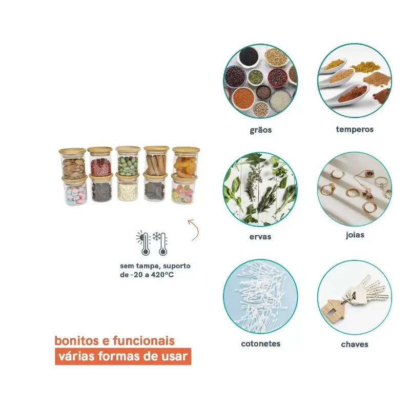 Esse é o kit do pote de vidro hermético e com tampa de bambu empilhável de 200ml, da OIKOS. Empilhável: a tampa de bambu tem um rebaixo que possibilita encaixar a base de um pote na tampa de outro - uma ajudinha extra para aproveitar bem todo espaço que tem.Versátil e multiuso: além de condimentos, nele também cabe purpurina, algodão, conchas, moedas, peças de jogos, itens de escritório e outras pequenices que você quiser guardar - isso que é versatilidade!Design decorativo: funcional e bonito, esse potinho transita muito bem entre os ambientes e dá um toque decorativo por onde quer que vá - quarto, banheiro, cozinha, sala, escritório ou lavanderia, você que manda.Veda de verdade: além de ter uma beleza natural da combinação vidro e bambu, esse pote tem em sua tampa um anel de silicone que garante uma vedação total - conservando os alimentos por muito mais tempo.Higiênico e durável: o corpo é de vidro borossilicato bem resistente e a tampa é de bambu, um material que evita a proliferação de bactérias.Fácil de lavar: basta limpar com detergente neutro e guardar quando estiver tudo bem sequinho.O Kit é formado por 10 potes:10 POTES DE MANTIMENTOS EMPILHÁVEL COM TAMPA DE BAMBU 200ML - OIKOSAltura: 7,8 cmDiâmetro: 6 cmEspessura do vidro dos potes: Aproximadamente 2,5 mm.