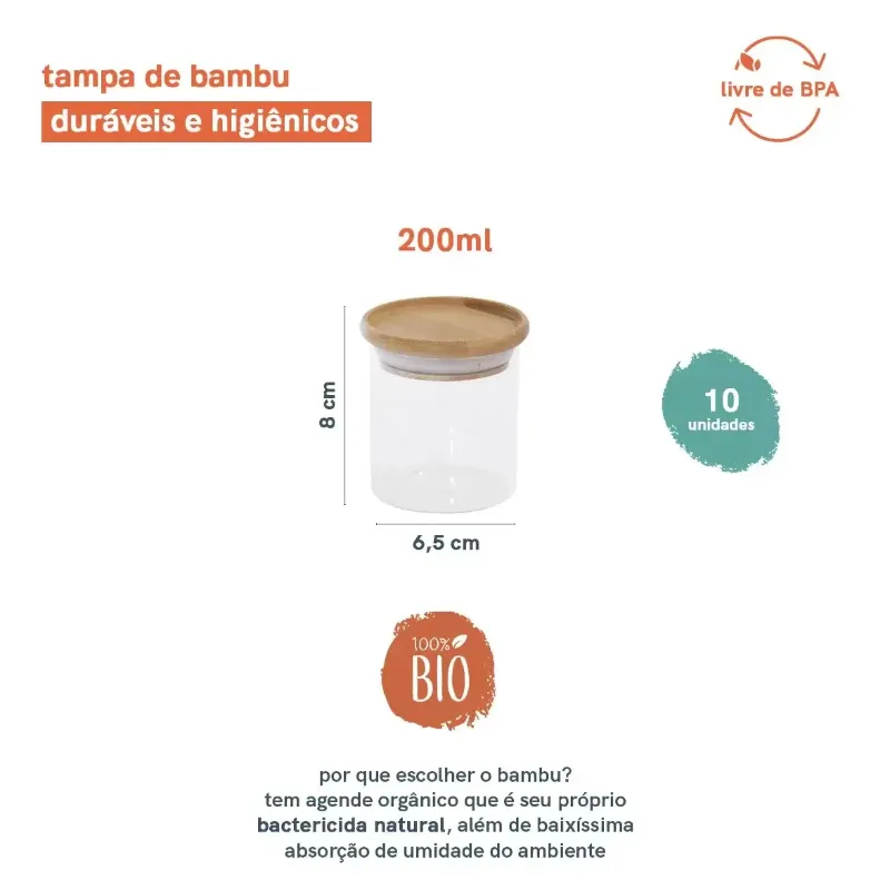 Potes de Vidro P/ Mantimentos C/ Tampa Bambu 200ml - 10 Pçs Oikos