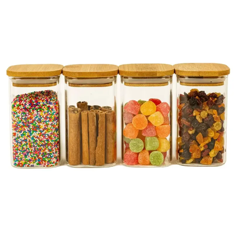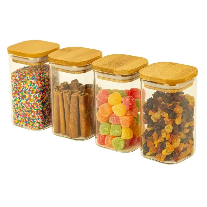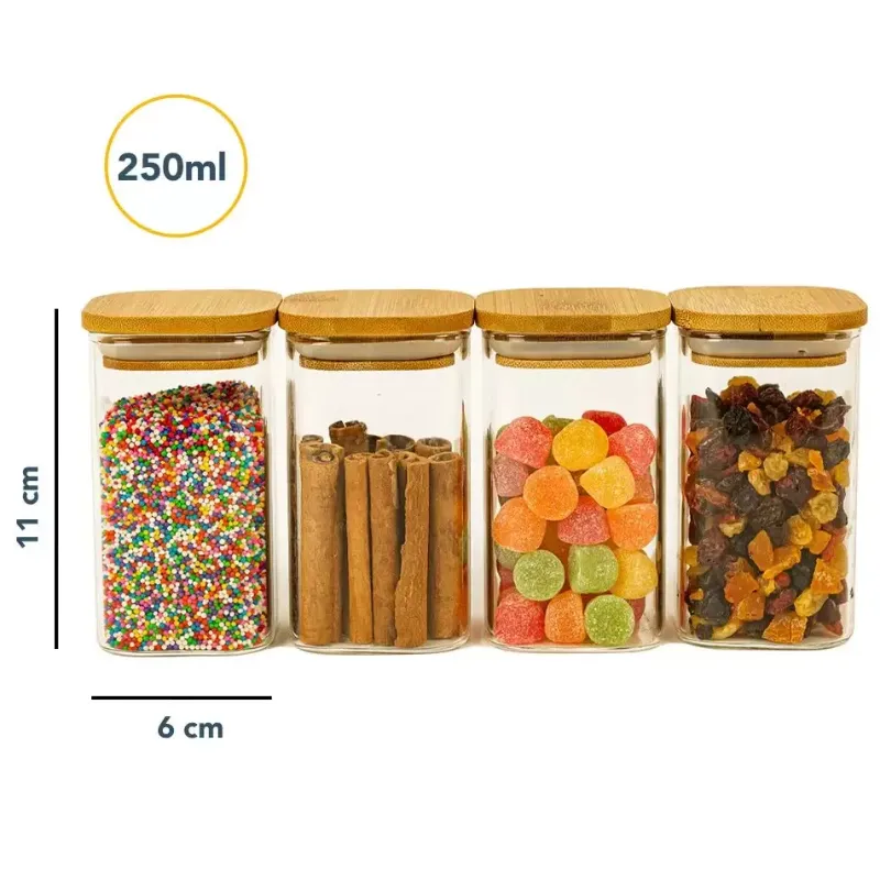 Kit 4 Potes de Vidro Tampa Bambu Quadrado Flat 250ml Oikos