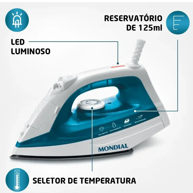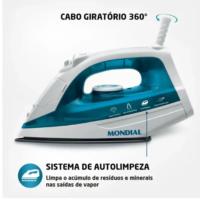 Ter um ferro de passar roupa em casa é fundamental para manter nossas roupas sempre desamassadas e bem apresentáveis. Na hora de escolher seu ferro de passar você encontrará diversas opções, não fique mais na dúvida e escolha um ferro de passar roupa que vai te trazer praticidade e facilidade. Mantenha suas roupas impecáveis com o ferro de passar roupa a vapor e a seco Mondial F-32! Conta com base antiaderente para um deslizar suave sobre os tecidos, seu reservatório de 125ml te dá capacidade suficiente para passar suas roupas sem esforço, com seletor de temperatura você escolhe uma das 6 opções de tecido que irá passar, para que a base se adapte a temperatura correta. Aproveite o controle de saída de vapor, ajustando à sua necessidade, passando a seco ou a vapor. Aliás, o vapor vertical libera uma alta quantidade de vapor, passando na horizontal ou direto no cabide, já o spray umidificador auxilia na remoção de vincos mais difíceis. A borda salva botões protege e não danifica os botões de suas roupas. O ferro F-32 na cor verde e branco, possui LED luminoso que indica o funcionamento do produto e o cabo giratório 360º que destrava os movimentos durante as passadas. Para limpar o acúmulo de minerais e resíduos naturais do reservatório use o sistema autolimpante.