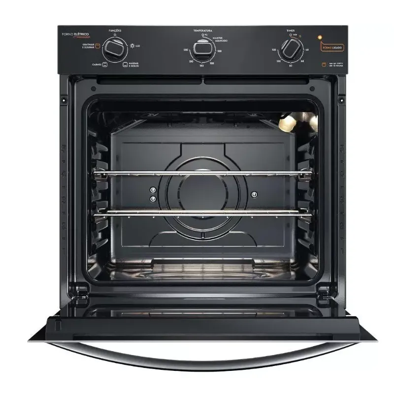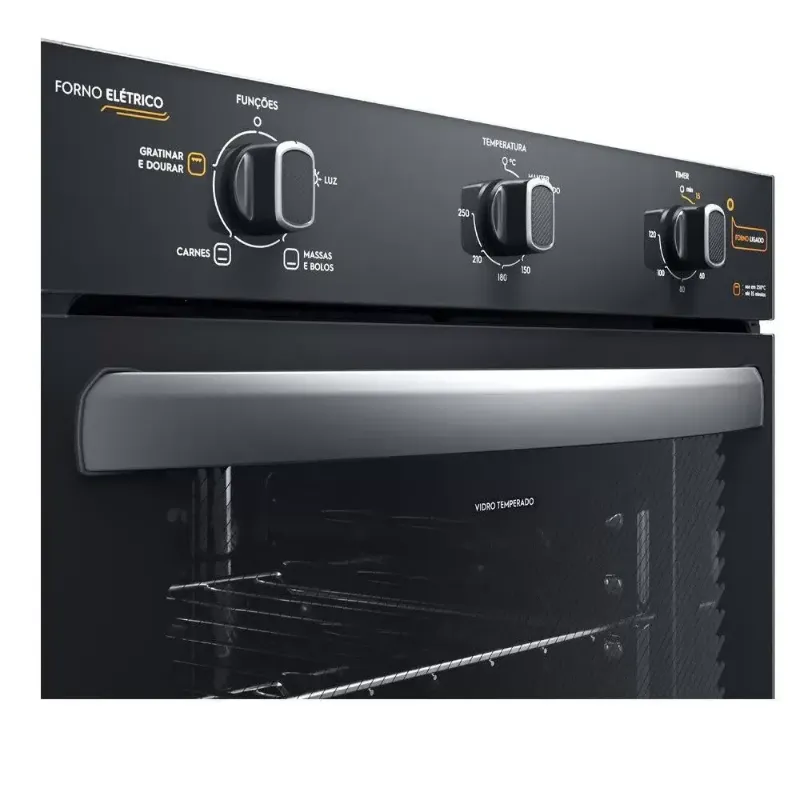 Para a cozinha ficar completa conte com o Forno de Embutir Elétrico Preto OC8EM é ideal para compor com os eletrodomésticos da sua casa, oferece praticidade na limpeza e possui capacidade que se encaixa perfeitamente em sua cozinha compacta. Conta com a Tecnologia TOPLimpaFácil: revestimento interno que evita o acúmulo de gordura e facilita a remoção de manchas, além de cantos arredondados e sem frestas que também facilitam a limpeza no dia a dia, deixando seu interior sempre limpinho. O forno possui a capacidade de 80L, revestimento interno do forno Esmaltação vitrificada, vem com vidro interno removível, permitindo a retirada do vidro interno com facilidade para uma limpeza mais profunda e completa do forno. Finalize suas receitas ao dourar a superfície dos alimentos e obtenha melhores resultados de textura e crocância com a Função Dourar. E aproveite as duas opções de Modos de Assar para um melhor resultado dependendo do tipo do alimento, sendo um para carnes e o outro para massas e bolos. Esse forno também conta com a Função Manter Aquecido, responsável por manter os alimentos sempre na temperatura ideal antes de servir, além do Timer Mecânico, que desliga o forno automaticamente de acordo com o tempo programado, oferecendo tranquilidade e segurança a cada preparo.