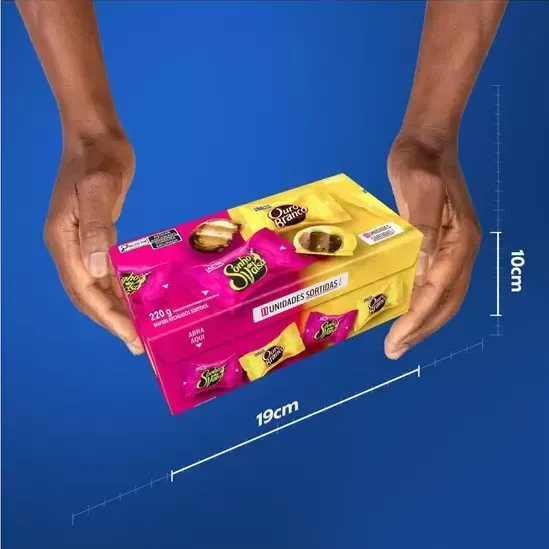 Se você é apaixonado por chocolate e adora saborear um pedacinho ao longo do dia, precisa ter sempre por perto. Perfeito para consumir puro ou preparar diversas receitas e no tamanho ideal para compartilhar com quem você gosta. A caixa de bombons sortidos da Lacta é tudo que você queria. Ouro Branco, é um verdadeiro tesouro para os amantes de chocolate branco, traz a combinação de um recheio cremoso com a deliciosa crocância da cobertura. O irresistível bombom Sonho de Valsa traz uma combinação de um recheio cremoso de amendoim e castanha de caju. Nesta versão com 11 unidades de 20g cada, é perfeito para ter sempre por perto, ou carregar com você na bolsa para quando bate aquela vontade de comer um delicioso doce.