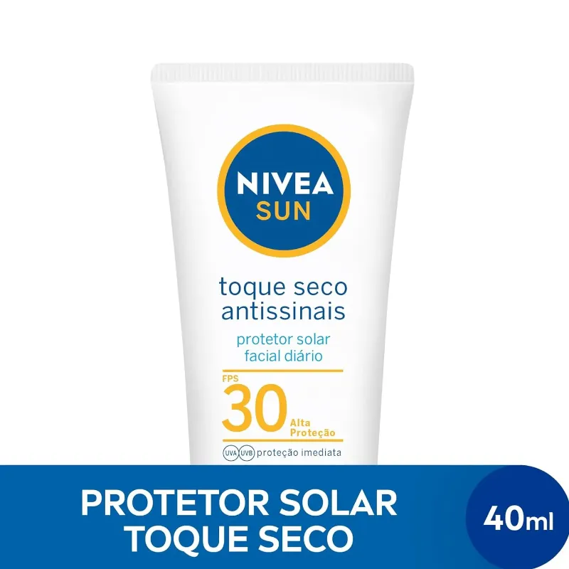 O que é? Protetor solar facial com textura leve e toque seco. Deixa a pele macia e ainda previne o envelhecimento. Confira +detalhes! Para que serve o Protetor Solar Facial Nivea Sun Toque Seco? Além de oferecer alta proteção dos raios UVA/UVB, ainda controla o brilho e deixa a pele radiante. Perfeito para ser usado antes da maquiagem. Benefícios e diferenciais - FPS 30 garante alta proteção solar - Não deixa a pele oleosa - Textura ultra leve - Resistente à água Como usar o Protetor Solar Facial Nivea Sun Toque Seco? Agite bem antes de usar. Antes da exposição ao sol, aplicar no rosto. Reaplique o produto a cada 2h ou depois de transpiração excessiva ou mergulho na água. Uma unidade de embalagem contém 40ml Precauções: • Aplique abundantemente antes da exposição ao sol. • Reaplicar sempre, após sudorese intensa, nadar ou banhar-se, secar-se com toalha e durante a exposição ao sol. • É necessária a reaplicação do produto para manter a sua efetividade. • Ajuda a prevenir as queimaduras solares. • Evitar exposição ao sol das 10 às 16 horas. • Evite exposição prolongada das crianças ao sol. • Para crianças menores de 6 (seis) meses, consultar um médico. • Se a quantidade aplicada não for adequada, o nível de proteção será significativamente reduzido. • Oferece alta proteção contra queimaduras solares e é indicado para pele muito sensível a queimadura solar. • Filtros solares em contato com o tecido podem causar manchas. Cuidados: Uso externo. Este produto não oferece nenhuma proteção contra insolação. Evite contato com os olhos e boca. Em caso de irritação, suspenda o uso e procure orientação médica. Manter fora do alcance de crianças e em local seco e fresco. Dermatologicamente testado. *Causado pela exposição solar/radiação.