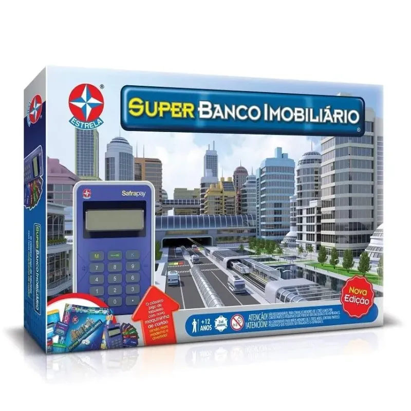 O tradicional jogo Banco Imobiliário, com a máquina de crédito e débito para fazer as transações bancárias. Inclui 1 tabuleiro, 28 títulos de posse, 6 cartões, 80 casas, 2 dados, 6 marcadores de metal, 1 máquina de cartão (pilhas não inclusas), 32 cartões noticia e 1 manual de instruções.