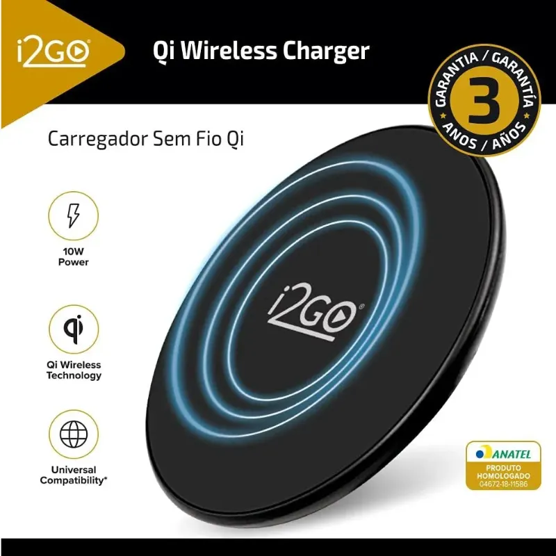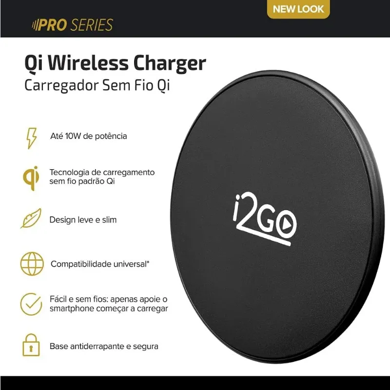 Material: ABS; O Carregador sem fio Fast Charge 10W i2GO PRO utiliza a tecnologia de carregamento sem fio padrão Qi. Seu design é super leve, discreto e compacto, com base antiderrapante e segura, sendo perfeito para usar na sua casa, escritório e onde mais quiser.Compatível com: -10W Fast Charge Samsung (S20 Ultra, S20+, S20, S10+, S10, S10e, S9+, S9, S8+, S8, Note 10, Note 9, Note 8) *Necessário carregador QC 2.0, QC 3.0 ou Power Delivery/FastCharge -7,5W Fast Charge iPhone (iPhone 12 Pro Max, 12 Pro, 12, 12 Mini, 11 Pro Max, 11 Pro, 11, XS Max, XS, XR, X, 8 Plus, 8) *Necessário carregador QC 2.0, QC 3.0 ou Power Delivery/FastCharge, -5W Carregamento padrão (LG V50, V40, V30+, V30, G8, G7, Sony Xperia XZ3 e outros compatíveis com Qi) *Necessário carregador 5V/2A -Carregamento de fones (AirPods Pro, AirPods 2, Galaxy Buds+, Galaxy Buds, Pixel Buds) *Necessário carregador 5V/2A Especificações Técnicas: Entrada: 5V 2A | 9V 1,5A (13,5W), Saída: 5V 1A | 9V 1,1A (10W máx), Eficiência de carregamento: > 80%, Alcance de Carregamento: 3 - 8mm, Frequência: 110 - 205kHz, Potência de Carregamento: 10W / 7,5W / 5W,Padrão Compatível: Qi, Indicador LED: -Em espera: LED vermelho -Carregando: LED azul; Support: QC3.0; Cabo de carga: Micro cabo de 30cm; Cor: Preto; Certificação: ROHS, FCC, CE standard;