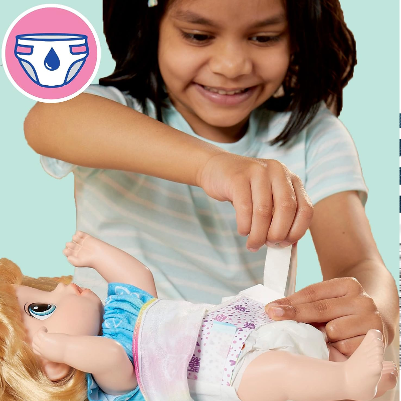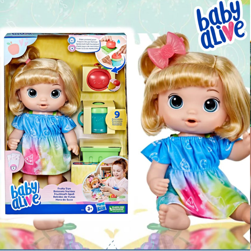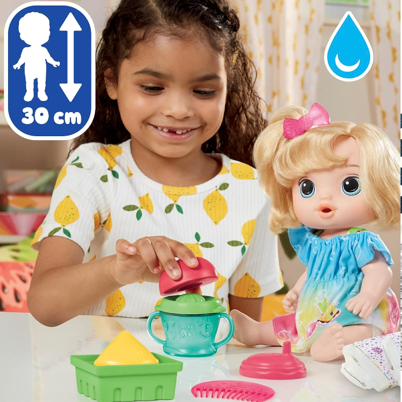 A Boneca Baby Alive Hora do Suco é um brinquedo perfeito para crianças a partir de 3 anos que adoram brincar de casinha e cuidar de bonecas como se fossem seus bebês. Com o kit da bebê Baby Alive Hora do suco, as crianças podem brincar de fazer sucos de mentirinha para a boneca e alimentá-la com a mamadeira incluída. O kit vem com uma máquina de sucos de mentirinha e duas frutas de plástico, uma maçã e um abacaxi. As crianças podem mergulhar as frutas na água e depois espremê-las na máquina de sucos para criar um suquinho de mentirinha para alimentar a boneca. Além disso, o kit também inclui uma cesta de frutas para que a brincadeira fique ainda mais realista. Uma das características mais interessantes da Boneca Baby Alive Hora do Suco é que ela é capaz de beber o suquinho de mentirinha e fazer xixi na fralda. Basta trocar a tampa da máquina de sucos pela tampa da mamadeira e alimentar a boneca. Depois de beber o suco, é hora de trocar a fralda (fraldas adicionais vendidas separadamente) para deixar a boneca sempre limpinha. A Boneca Baby Alive Hora do Suco vem com roupa inspirada em frutas, o que torna a brincadeira ainda mais divertida e colorida. Além disso, a boneca vem acompanhada de um pente e uma presilha com laço para que as crianças possam pentear e arrumar o cabelo loiro da boneca. O brinquedo é recomendado para crianças a partir de 3 anos e é um excelente presente de aniversário ou outras celebrações. Com a Boneca Baby Alive Hora do Suco, as crianças podem desenvolver habilidades motoras e sociais, além de estimular a criatividade e imaginação. A Boneca Baby Alive Hora do Suco é uma ótima opção de brinquedo para as crianças que adoram cuidar de bonecas como se fossem bebês de verdade. Com o kit de sucos de mentirinha, as crianças podem alimentar a boneca e ainda se divertir muito com a brincadeira de trocar a fralda. Sem dúvida, um brinquedo que vai proporcionar muitas horas de diversão e aprendizado para os pequenos.