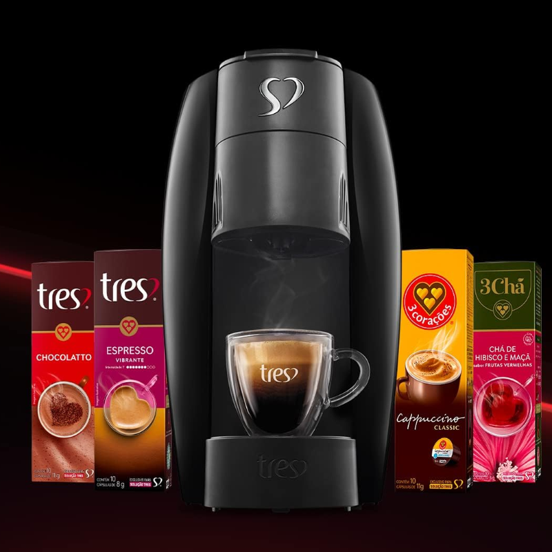 A Cafeteira de Espresso e Multibebidas Automática LOV TRES 3 Corações possui extração silenciosa que garante cafés espressos perfeitos, bebidas cremosas, cafés filtrados e chás ao simples toque de um botão. A LOV tem um compartimento externo para facilitar o descarte das cápsulas usadas e suporte para xícaras e copos long drink, que garante a praticidade na hora de preparar as suas bebidas preferidas na quantidade ideal. Com design inovador inspirado no grão de café, a LOV apresenta um estilo moderno e compacto. São 3 sistemas em uma única máquina! As cafeteiras 3 Corações preparam cafés espressos, filtrados, cappuccinos, bebidas cremosas e chás com praticidade e perfeição! Escolha o que mais combina com você. Para cada estilo, uma máquina TRES. As Cápsulas e Máquinas do sistema TRES® são livres de BPA. *Compatível somente com cápsulas TRES®