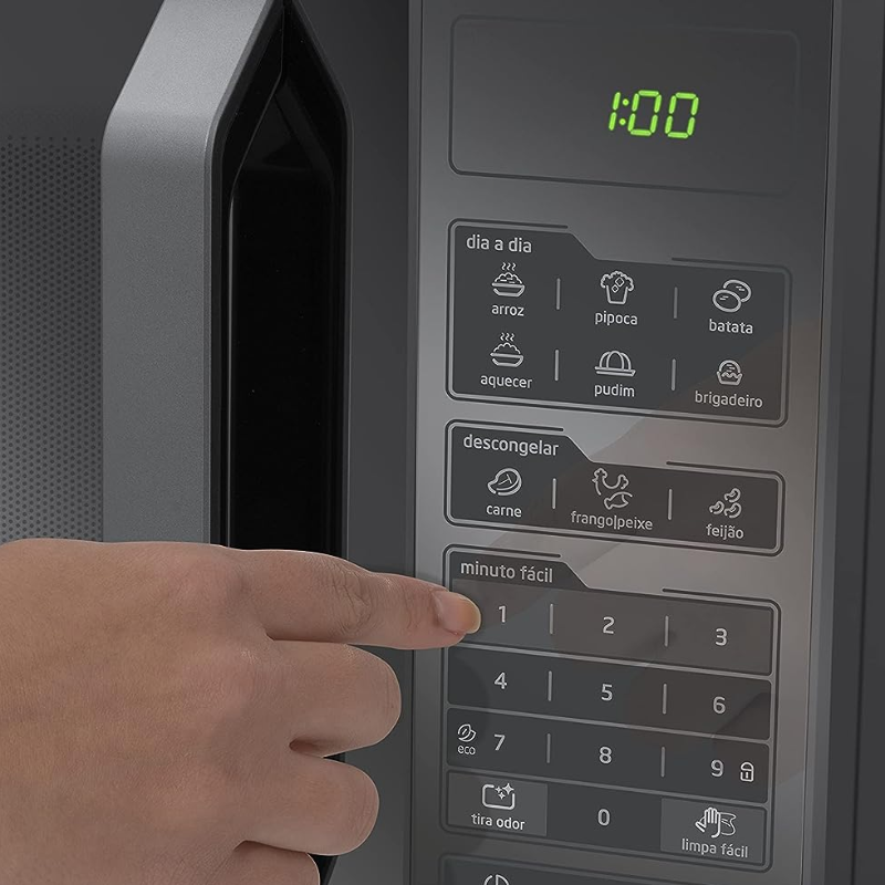 O Micro-ondas Midea vai se tornar seu melhor amigo na cozinha. Retirar xícaras e canecas vai ser muito mais fácil: possui Prato Inteligente, que retorna a alça dos recipientes para a posição inicial. O Micro-ondas Midea é super completo! Com Função Preferido, é possível deixar salvo o programa e tempo de suas receitas prediletas. Além de todas essas facilidades, conta com Minuto Fácil para acesso rápido de 1,2 ou 3 minutos, Função Tira Odor, Limpa Fácil e Função Eco para mais economia de energia com o visor desligado.