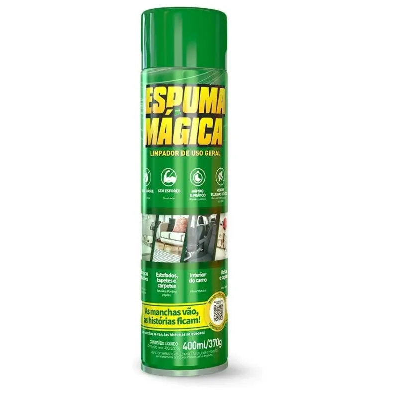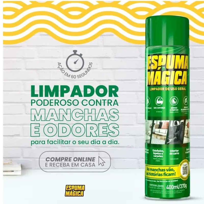 Sua performance de limpeza única, especialmente tecidos como sofás, tênis e bancos removendo também as sujeiras mais difíceis como graxa, gordura, resíduos de alimentos e sujeira de tráfego. A Espuma Mágica foi criada para fazer você ganhar tempo em seus afazeres. Dessa forma, você tem muito mais tempo para se divertir com a família e amigos, enquanto a limpeza vira apenas mais uma pequena tarefa do seu dia a dia.