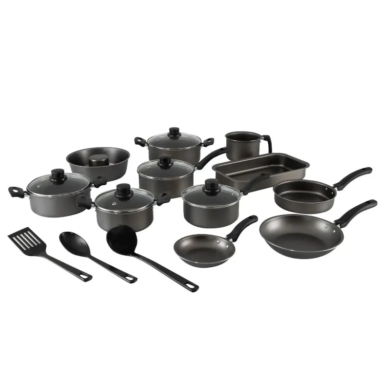 O Jogo de Panelas Especial da Eirilar é perfeito para trazer mais praticidade e versatilidade para sua cozinha, com vários utensílios para você fazer suas receitas. O conjunto é composto por 14 peças lindas na cor grafite, entre panelas, formas e talheres. São 3 Caçarolas e 2 panelas em alumínio grafite com revestimento interno antiaderente, que impede que os alimentos grudem, cabos/alças em plástico resistente e tampas em vidro com saída de vapor. Vem ainda 3 frigideiras no mesmo material e em tamanhos diferentes, 1 fervedor, 1 assadeira, 1 forma redonda. Completando o kit, 1 colher de servir, 1 concha e 1 espátula, em nylon silicone que não arranham a superfície das peças.