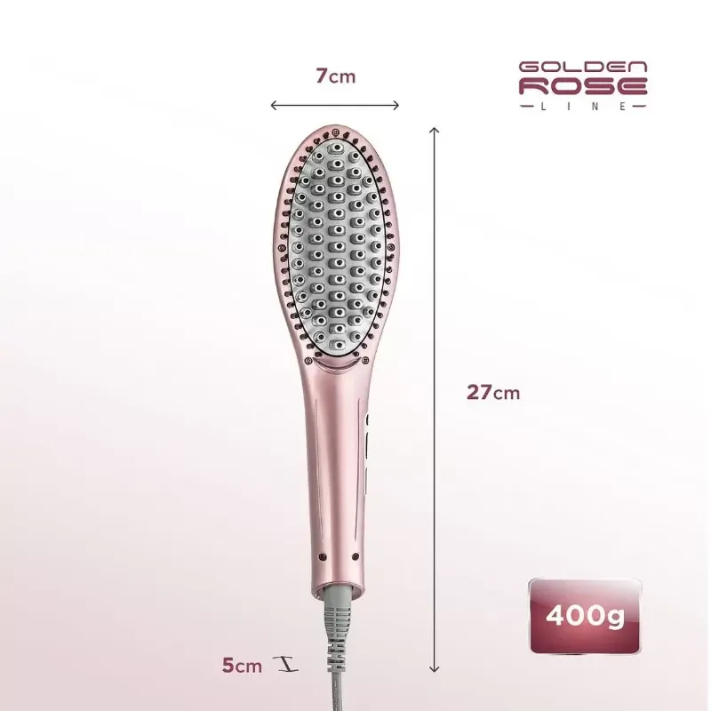Escova Alisadora de Cabelo EA-02 Golden Rose Bivolt: alisa seu cabelo pois a base aquece como uma prancha. Com Tourmaline íon, cerdas com molas, display digital de temperatura, bivolt automático; acompanha necessaire. Elimine o frizz e ressalte o brilho dos cabelos com a escova alisadora elétrica EA-02: tem design similar a uma escova comum, mas esquenta e libera íons, alisando o cabelo com o movimento da escovação.