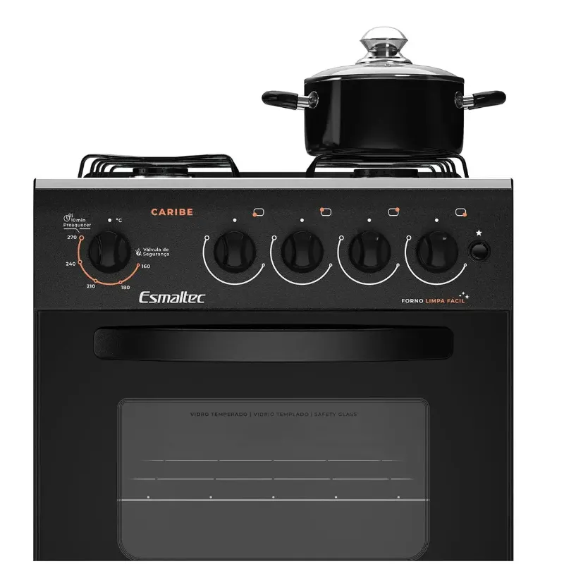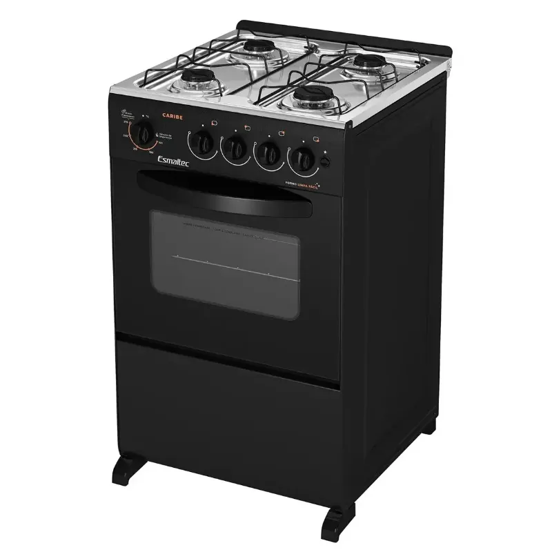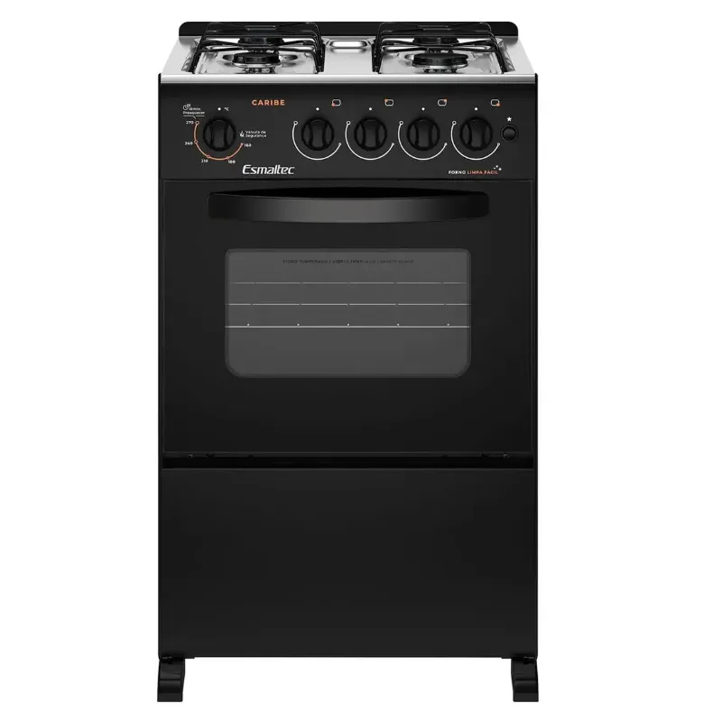Se você tá procurando por um fogão novo pra sua cozinha, dá uma olhada nessa opção. Esse Fogão a Gás 4 bocas da Esmaltec. Ele é um fogão de Piso com design em vidro temperado moderno que valoriza sua cozinha e deixa a limpeza fácil, tornando o preparo das receitas preferidas da sua família ainda melhor. O fogão CARIBE tem 4 bocas e é na cor Preto, tem acendimento automático e painel. O Forno Simples possui boa capacidade interna, são 53,2 litros. Sem falar nos 1 queimador família 2,0kW e 3 queimadores pequenos 1,7kW, forno limpa fácil, novas trempes e pés altos e com novo design, que fica mais fácil atá na hora de fazer a limpeza.