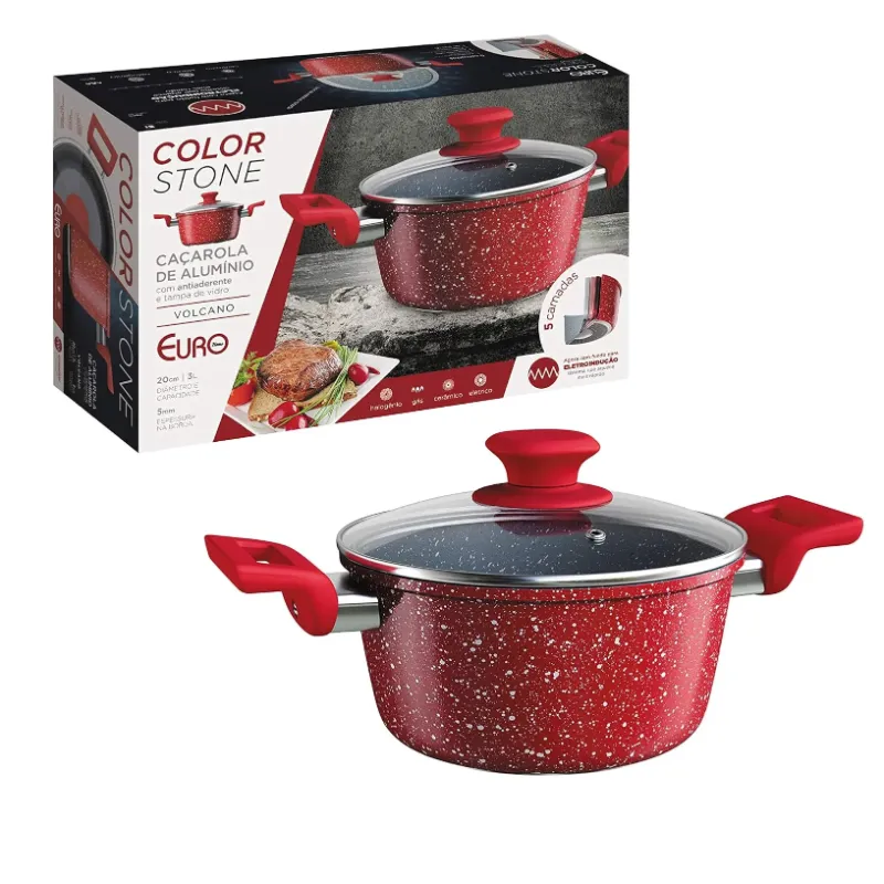 Com a Caçarola Colorstone você vai transformar seu jeito de cozinhar e seus pratos serão executados com excelência. Tudo isso porque as panelas Colorstone contam com o que há de mais moderno para garantir o preparo de refeições saborosas com máxima eficiência. A Caçarola Colorstone possui 5 camadas. A primeira camada é a antiaderente, ela evita que os ingredientes grudem mesmo com uso de pouquíssimo óleo. Para garantir sua durabilidade, há uma segunda camada antidesgaste. A camada de alumínio cumpre a função de distribuir o calor do melhor modo possível, diminuindo o tempo de preparo das refeições. A quarta camada é a pintura ultra resistente, e a base de finaliza essa composição. A Colorstone é fácil de limpar, não deforma e estará sempre pronta para o próximo uso. Prepare refeições mais saborosas e saudáveis com as panelas Colorstone.
