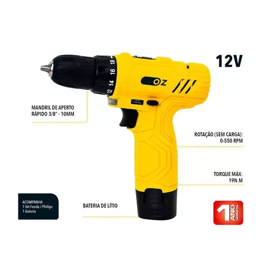 Furadeira Parafusadeira a Bateria 12V Lítio PB3000 Oz