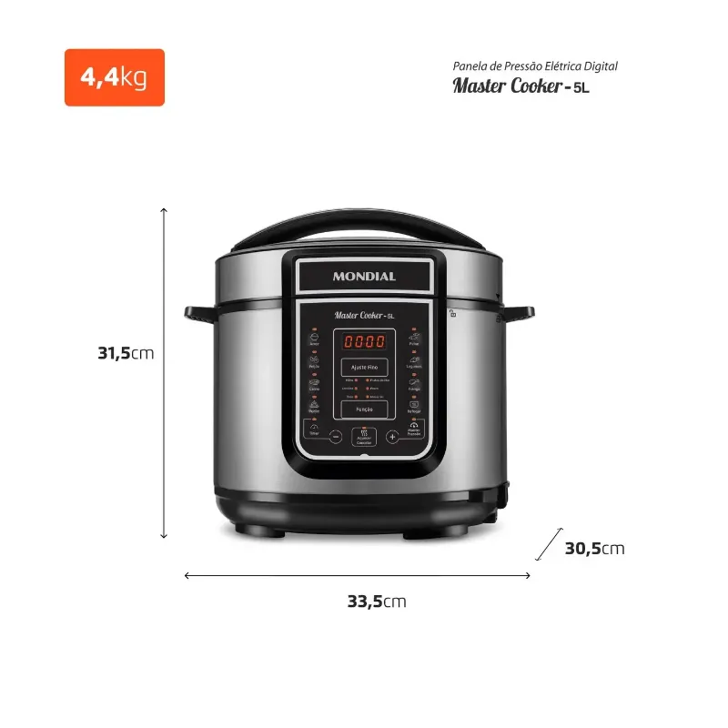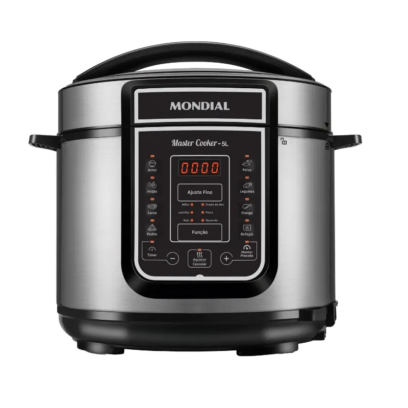 Com capacidade de 5L, a panela de pressão elétrica Digital Master Cooker PE-38 da Mondial tem painel digital, 14 funções programadas e ajuste manual do tempo. Ela desliga sozinha, mantém a comida quente e pode ser programada 24h antes. Esta panela de pressão elétrica tem o tamanho ideal para as suas receitas. Ela prepara comidas como feijão, sopa, arroz, arroz integral, peixe, carne suína, carne, músculo, legumes, refogados e até doces. Sua cuba removível e antiaderente não gruda e é mais fácil de limpar, indo até na máquina de lavar loucas. Sua tampa tem alça ergonômica, antitérmica e trava de segurança. Seus 900W de potência garantem preparos mais rápidos. Ela ainda conta com temporizador (timer) e foi desenvolvida para uso doméstico.