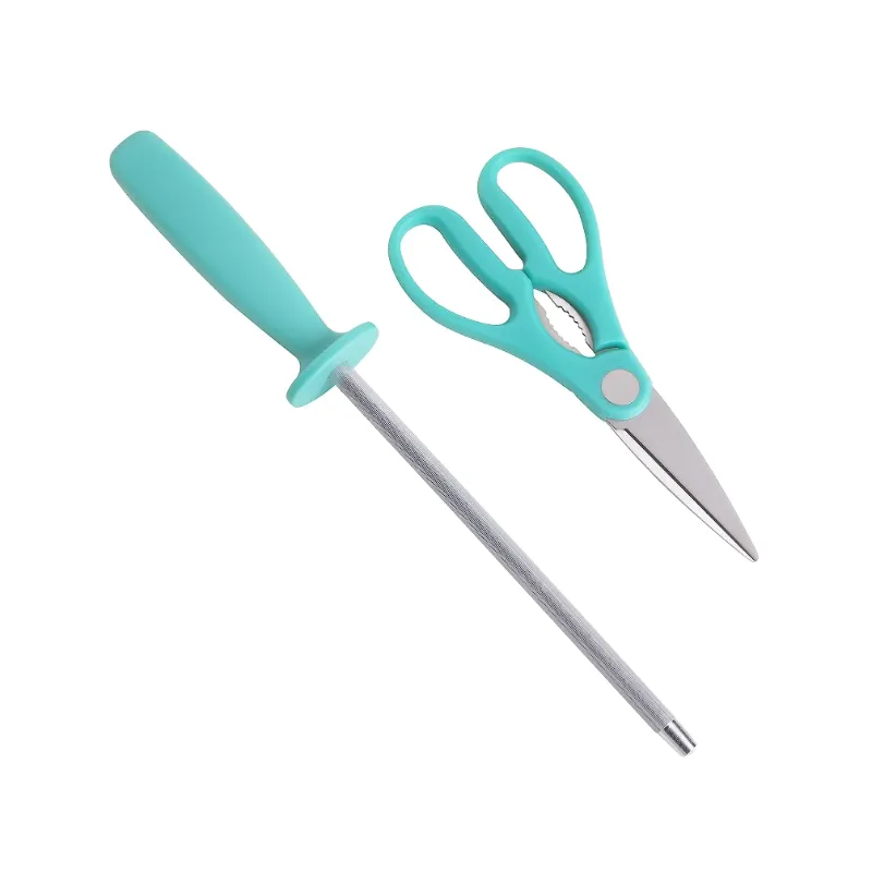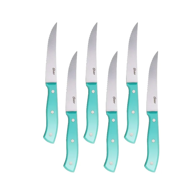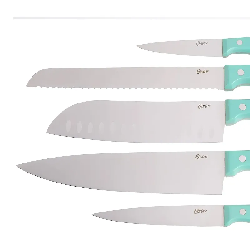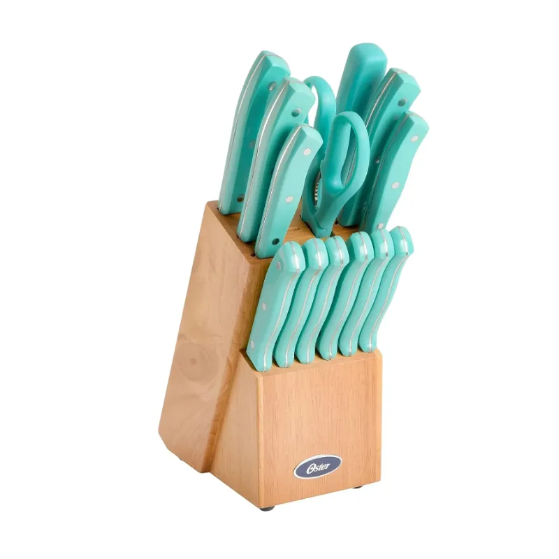 Certifique-se de que todas as suas necessidades de fatiar e cortar em cubos sejam atendidas com o abrangente conjunto de talheres Oster Evansville de 14 peças. Cada peça desta coleção oferece precisão e durabilidade, e seu visual elegante é complementado por um belo acabamento em aço inoxidável. Tem lâminas de aço inoxidável resistentes a manchas e ferrugem e alças na cor turquesa para equilíbrio. Todas as peças são armazenadas em um prático bloco de madeira preta, adicionando elegância à sua bancada. Alças ergonomicamente projetadas para conforto durante o corte. Uso recomendado: residencial
