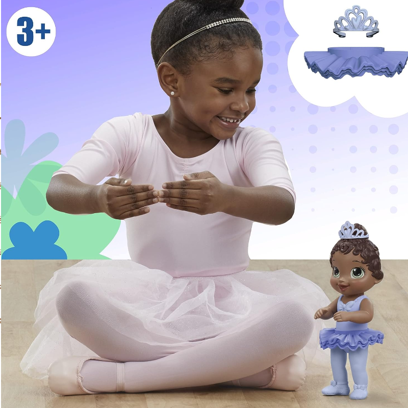Para dançar e se divertir: A Boneca Baby Alive Hasbro Doce Bailarina é a companhia perfeita para criar incríveis passos de balé, oferecendo uma experiência divertida e única. Este modelo traz a figura da bailarina que se destaca por sua doçura e elegância. Crie passos de dança exclusivos. As crianças podem treinar coreografias com muito mais diversão na presença da bailarina Baby Alive Hasbro. Com muito estilo, a boneca está vestida com um traje moldado 100% em plástico, uma saia de tule e tiara em forma de coroa. Lembrando que tanto a tiara quanto a saia são peças que podem ser removidas ou trocadas por outros acessórios, aumentando as possibilidades da brincadeira. A escolha certa para crianças que amam se movimentar e compartilhar experiências, a boneca Baby Alive é a escolha perfeita. É possível vestir a boneca com outros acessórios que a criança tiver em casa e criar lindos espetáculos de dança. Recomendações: Além disso, a boneca Baby Alive Hasbro é fabricada com materiais seguros e é adequada para crianças acima de três anos de idade.
