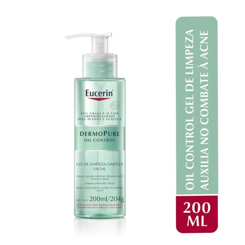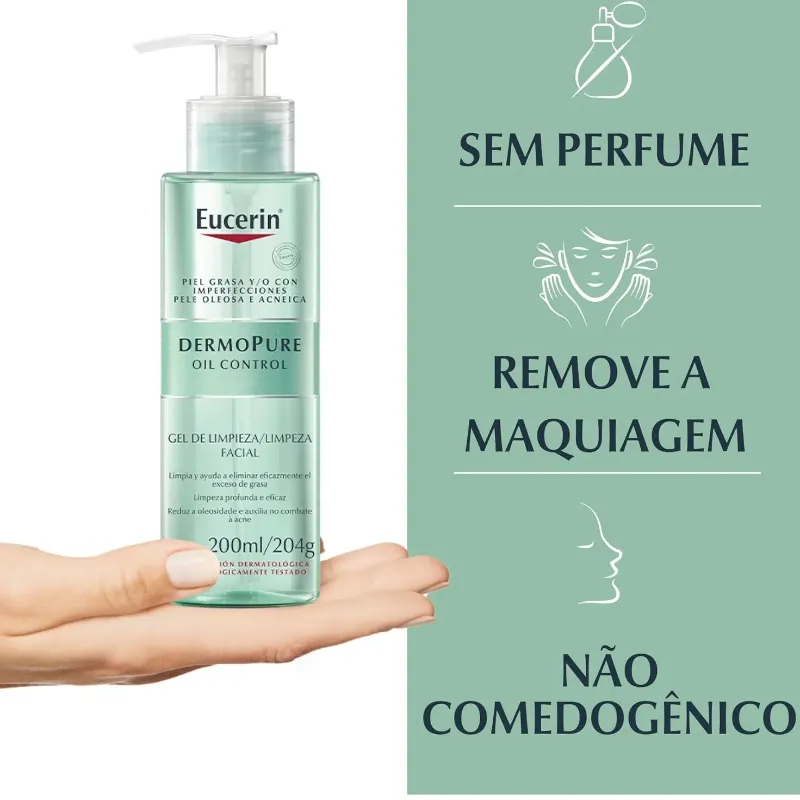 Eucerin Dermo Pure Oil Control Gel de Limpeza Facial limpa suavemente e elimina de forma eficaz o excesso de oleosidade, removendo as impurezas e a maquiagem devido à sua fórmula sem sabão e com 6% de tensoativo anfotérico, proporcionando sensação de limpeza, refrescância e maciez. Estudos clínicos e dermatológicos comprovam muito boa eficácia e tolerabilidade em pele oleosa e com propensão à acne. *Não comedogênico*