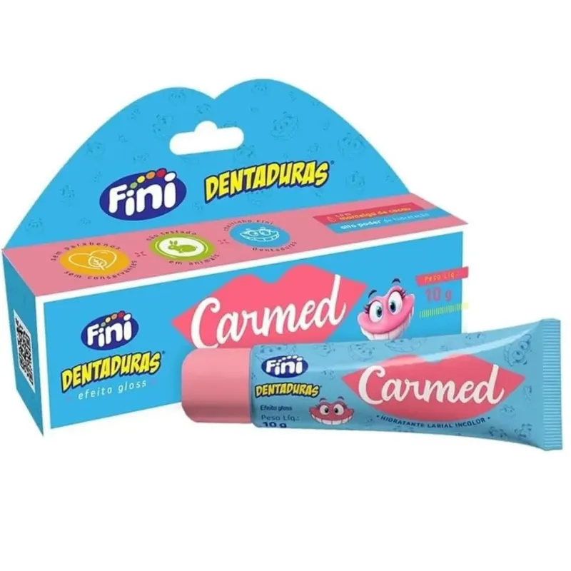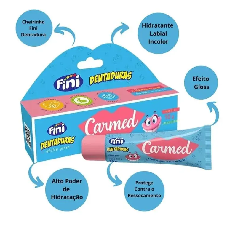CARACTERÍSTICAS - HIDRATANTE LABIAL CARMED FINI DENTADURAS 10G Carmed Fini Dentaduras é um hidratante labial incolor de uso diário e que conta com alto poder de hidratação e reparação. Protege contra o ressecamento dos lábios, deixando-os macios e hidratados, e tem o aroma de Fini Dentaduras. Pode ser usado com batom e é livre de parabenos e conservantes. Não é testado em animais. Uso externo a partir dos 3 anos. BENEFÍCIOS Alto poder de hidratação e reparação; Doce aroma de Fini Dentaduras; Incolor, pode ser usado com batom; Não é testado em animais; Livre de parabenos e conservantes. QUEM DEVE CONSUMIR E QUANDO? Uso externo a partir dos 3 anos. Pode ser usado sempre que sentir necessidade para a hidratação dos lábios.