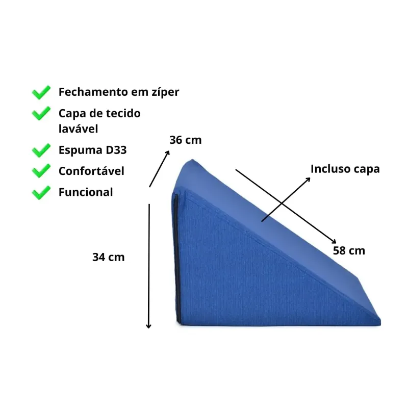 Ela proporciona uma inclinação ideal para você apoiar as costas ou as pernas, em vários ângulos diferentes. Sua espuma é de alta qualidade, densidade 33 e NÃO é espuma aglomerada (ou seja espuma reciclada), acompanha capa de tecido e fechamento em zíper.