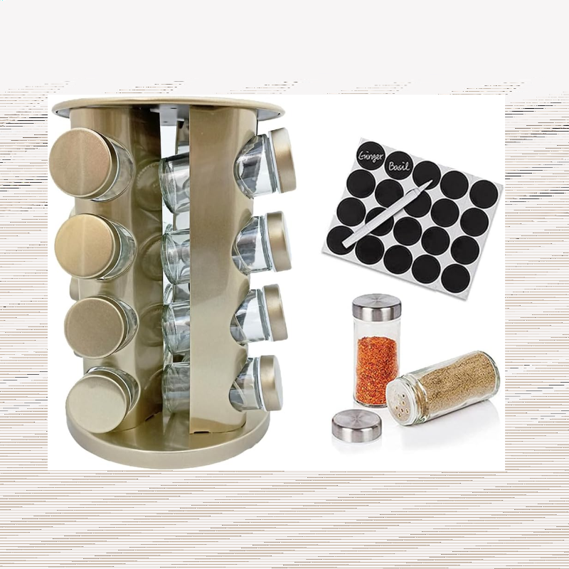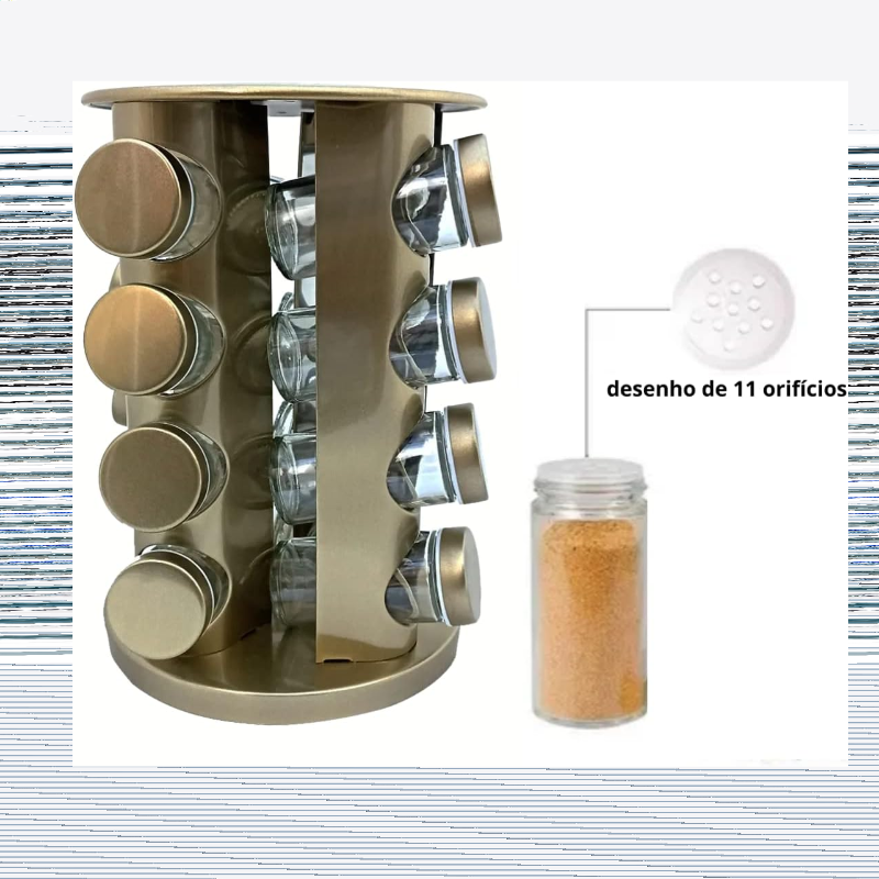 A cozinha é um dos lugares mais especiais da casa e merece todas as atenções na hora de ser decorada e organizada. O porta temperos é super funcional, prático, tem um formato moderno, pode armazenar seus condimentos de forma correta e em um mesmo local. Tenha a praticidade, organização e beleza que você e sua cozinha merecem! Características Possui base giratória: visualize todos os temperos com um simples giro Tenha todos os ingredientes ao seu alcance na hora de cozinhar Material: vidro e meta Possui 16 Potes de vidro que possuem tampa em Aço Inox que armazenam em média 80 gramas de temperos Medidas Aproximadas: 28 x 17 x 17 cm