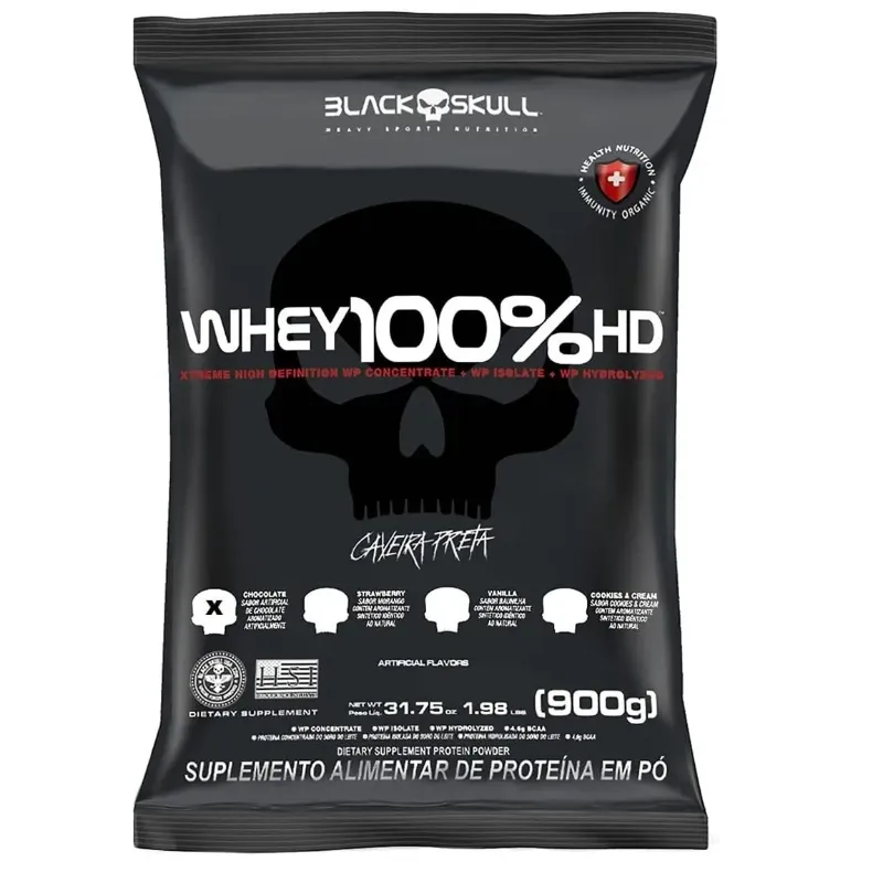 Whey 100% HD é mais um mega suplemento da linha caveira preta! Composto por três tipos de whey protein (concentrado, isolado e hidrolisado), ele é uma ótima opção para auxiliar no ganho de massa muscular! Além disso, sua composição conta também com a adição de BCAA, aminoácidos de cadeia ramificada que contribuem para uma melhor recuperação pós-treino. INGREDIENTES: Proteína concentrada do soro do leite, proteína isolada do soro de leite, proteína hidrolisada do soro do leite, l-leucina, l-isoleucina, l-valina, aromatizante, espessante goma xantana, corante vermelho beterraba, acidulante ácido cítrico, edulcorantes sucralose e acessulfame de potássio. CONTÉM LACTOSE. NÃO CONTÉM GLÚTEN. COMO CONSUMIR WHEY 100% HD? Misture 3 colheres de sopa (aprox. 30g) de Whey 100% HD em 150 ml de água, ou de acordo com a consistência desejada, e consuma uma vez ao dia ou de acordo com a orientação de um profissional especializado. Recomendação para adultos acima de 19 anos de idade. WHEY PROTEIN Um dos suplementos mais consumidos do mundo atualmente por diversas áreas no esporte como também na nutrição clínica, derivado do soro do leite, mais conhecido como Whey Protein, garante proteína de alto valor biológico com objetivos de manutenção muscular, auxiliar no anabolismo e recuperação das fibras musculares de praticantes de atividades físicas em geral até em pacientes que necessitam de uma dieta enteral. As proteínas obtidas a partir do soro do leite são classificados conforme o seu grau de processamento, como: proteínas concentradas, isoladas e hidrolisadas. SRO - um processo de refinação que remove os contaminantes usando pressão da água para forçar as moléculas através de uma membrana semipermeável. Durante esse processo, os contaminantes são filtrados e lavados, deixando a proteína mais pura.