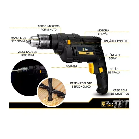 FURADEIRA COM IMPACTO 3/8" 10MM 550W TBF550 110V - The Black Tools