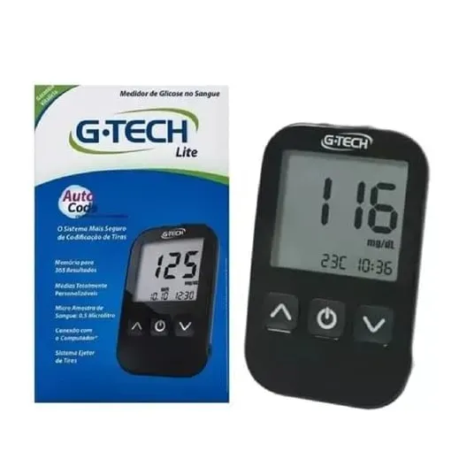 O Medidor de Glicose G-TECH Lite traz para o mercado brasileiro o que há de mais moderno para controle da glicose no sangue. Com design diferenciado e moderno, o aparelho é altamente portátil, oferece um amplo display que facilita a leitura e o torna ainda mais atraente. Possui dispositivo ejetor de tiras que possibilita o descarte da tira utilizada sem o contato com as mãos, de maneira mais segura e higiênica. Além de novas tecnologias como AutoCode e enzima GDH-FAD, o aparelho oferece diversas funções que auxiliam o usuário a controlar cada vez melhor a glicose no sangue. O sistema AutoCode é o que há de mais seguro e moderno para utilização de tiras de teste. Cada tira possui um código interno que é automaticamente reconhecido e ajustado pelo aparelho, sem a necessidade de qualquer interferência do usuário. Este sistema proporciona um resultado ainda mais preciso que outros sistemas sem código e elimina a possibilidade de resultados incorretos oriundos de erro na codificação manual.
