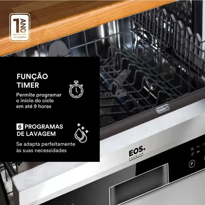 A lava louças Eos premium chegou para dar maior praticidade e economia para você. Altamente econômica, a lava louças gasta pouca energia e muito menos água que a lavagem manual, ao mesmo tempo que garante a perfeita limpeza de sua louça. Apesar de seu tamanho compacto, a lavadora EOS possui um grande espaço interno e lava simultaneamente a louça de até 14 pessoas. Seus 6 programas de lavagem são especialmente pensados para se adaptarem a todas as suas necessidades, além de serem facilmente selecionados ao toque de um botão, de forma fácil e rápida. Adicionalmente a lavadora Eos conta ainda com programação para adiar o início do ciclo, permitindo que você programe para que a conclusão do processo seja quando você estiver chegando em casa ou acordando pela manhã. O painel possui ainda trava inteligente, para evitar que crianças liguem o produto ou alterem a programação por acidente. Principais Características: Mais economia com consumo de energia e eficiência A - Baixo gasto de luz e menor consumo de água em relação a lavagem manual Espaçosa - Lava a louça de até 14 pessoas de cada vez Melhor lavagem - Com dois borrifadores de água para uma melhor lavagem 6 programas de lavagem, que se adaptam perfeitamente às suas necessidades Intenso: Realizado a 60°C e com duplo enxágue, para garantir a limpeza profunda Eco: Sua louça limpa com um gasto de água e luz ainda menor Leve: Proteção para sua louça, evitando altas temperaturas - lavagem a 45°C 60min: Para louças de uso diário, com sujeira de uso normal ou leve Rápido: Para resolver a louça suja rapidamente, ideal para louças que não precisam de secagem Pré-Enxague: Para retirar odores e sujeiras mais grossas de louças que serão lavadas mais tarde Função Timer - Permite programar para adiar o início em até 9 horas Mais moderna - Painel com tecnologia digital touch Silenciosa - apenas 49dBa de ruído; Com display digital para informar o tempo faltante para o fim do programa