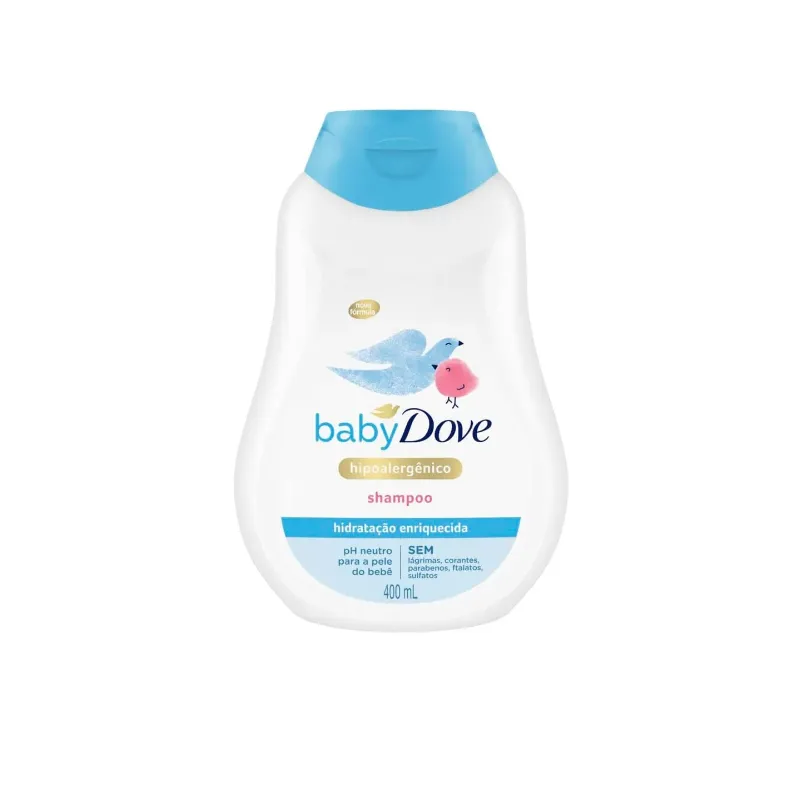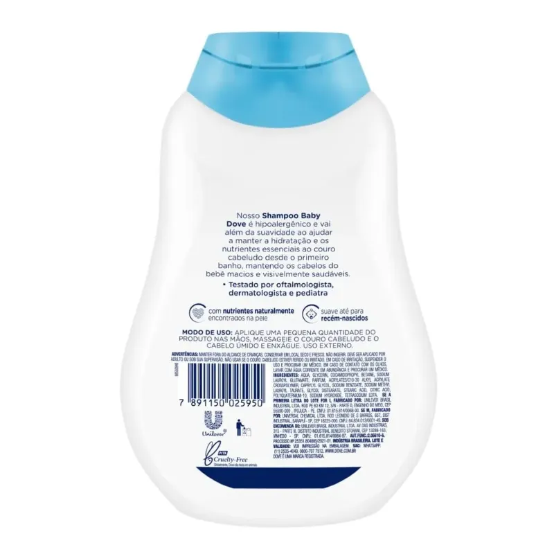 O Shampoo Baby Dove Hidratação Enriquecida nutre gentilmente e deixa os cabelos do bebê macios e visivelmente saudáveis • Este shampoo suave é formulado com pH neutro para a pele do bebê, sem lágrimas, corantes, parabenos, ftalatos ou sulfatos, e é testado por oftalmologista, dermatologista e pediatra • Shampoo hidratante feito com nutrientes naturalmente encontrados na pele do bebê • O Shampoo Baby Dove Hidratação Enriquecida é suave até para recém-nascidos • A fórmula deste shampoo é hipoalergênica e suave, ajudando a manter a hidratação e os nutrientes essenciais ao couro cabeludo desde o primeiro banho • O Shampoo Baby Dove Hidratação Enriquecida é certificado com o selo Cruelty-Free PETA. Globalmente, Dove não testa em animais O Shampoo Baby Dove Hidratação Enriquecida é hipoalergênico e muito suave, ajudando a manter a hidratação e os nutrientes essenciais ao couro cabeludo do bebê desde o primeiro banho, tendo como resultado cabelos macios, limpos e visivelmente saudáveis. Criado com pH neutro para a pele do bebê e nutrientes naturalmente encontrados na pele, este shampoo cuida do delicado couro cabeludo e deixa com sensação e aparência saudáveis desde seu primeiro uso. Além de limpar delicadamente, ajuda a hidratar o couro cabeludo e os fios de cabelos do seu bebê, mantendo-os macios e bem cuidados após o uso. É formulado sem corantes, parabenos, ftalatos ou sulfatos, e é testado por oftalmologista, dermatologista e pediatra. Aproveite toda hora do banho com esta cuidadosa fórmula hipoalergênica, suave e sem lágrimas, do shampoo Baby Dove. Com um perfume delicado e desenvolvido especialmente para o cabelo do bebê, esse shampoo para bebês deixa os cabelos do seu pequeno saudáveis e macios. Modo de uso: aplique uma pequena quantidade de produto nas mãos, massageie o couro cabeludo e o cabelo úmido e enxágue. Após lavar os cabelos do seu bebê, experimente aplicar o Condicionador Baby Dove, para ajudar a manter os fios dos cabelos macios e fáceis de pentear. O Shampoo Baby Dove Hidratação Enriquecida, é certificado com o selo Cruelty-Free PETA. Globalmente, Dove não testa em animais."