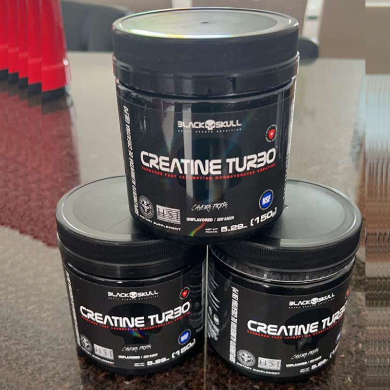 Descrição: - Creatine Turbo da linha Caveira Preta Series da Black Skull USA é um suplemento a base de Creatina Monohidratada e Maltodextrina. Onde é comprovado que, a utilização de carboidratos em conjunto com a creatina, promove maior eficácia no efeito da creatina, além do carboidrato agir no aumento de energia, visando apoiar seus resultados nas atividades físicas, oferecendo maior energia e consecutivamente, melhor desempenho. Com seus benefícios, apoia também o ganho de massa e a conclusão dos treinos mantendo a qualidade de suas repetições. Sendo recomendado o consumo de 6g (1 ¼ colher de chá) ao dia. Características: - Marca: Black Skull - Modelo: Kit 3X Creatine Turbo 150gr Informação Nutricional Porção 1 1/4 colher de chá (Aprox. 6g): - Valor Energético: 12kcal - Carboidratos: 3g - Creatina: 3000mg Ingredientes: - Creatina Monohidratada - Maltodextrina - NÃO CONTEM GLÚTEN Como Consumir: - Adicionar 1 ¼ colher de chá (6g) do Creatine Turbo em 150ml de água e consumir uma vez ao dia ou conforme recomendação do fabricante. Importante que seu consumo esteja associado a uma alimentação equilibarada. Saiba Mais: - A creatina é um composto de aminoácido criado pelos rins, fígado e pâncreas, por meio dos aminoácidos arginina e glicina, presentes nos alimentos com carnes e peixes, sendo que a cada 1kg de carne vermelha, encontra-se 5g de creatina. O uso desse suplemento sempre esteve em alta no mercado devido sua função de fortalecimento de energia temporária, aumento de força e promove a hipertrofia devido ao aumento de força e volume de treinamento. Atenção: - Este produto não é um medicamento - Não exceder a recomendação diária de consumo indicada na embalagem - Mantenha fora do alcance das crianças - Este produto não deve ser consumido por gestantes, lactantes e crianças Conteúdo da Embalagem: - 3X Suplemento Alimentar Creatine Turbo 150g Black Skull Observação: - Os suplementos alimentares são dispensados da obrigatoried