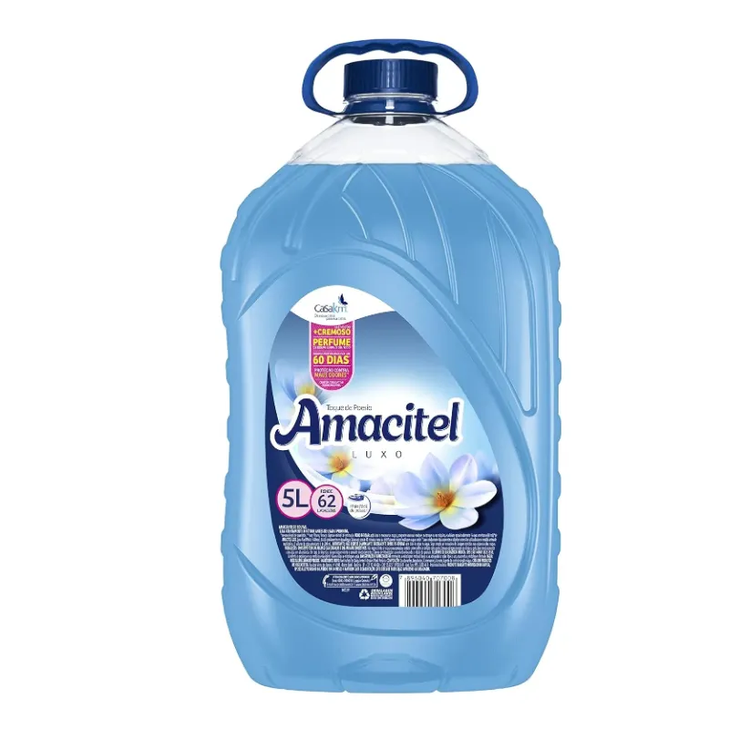 Amaciante Amacitel Luxo Toque de Poesia 5L. Deixa a roupa macia e prática para passar, rendendo em até 25 lavagens.