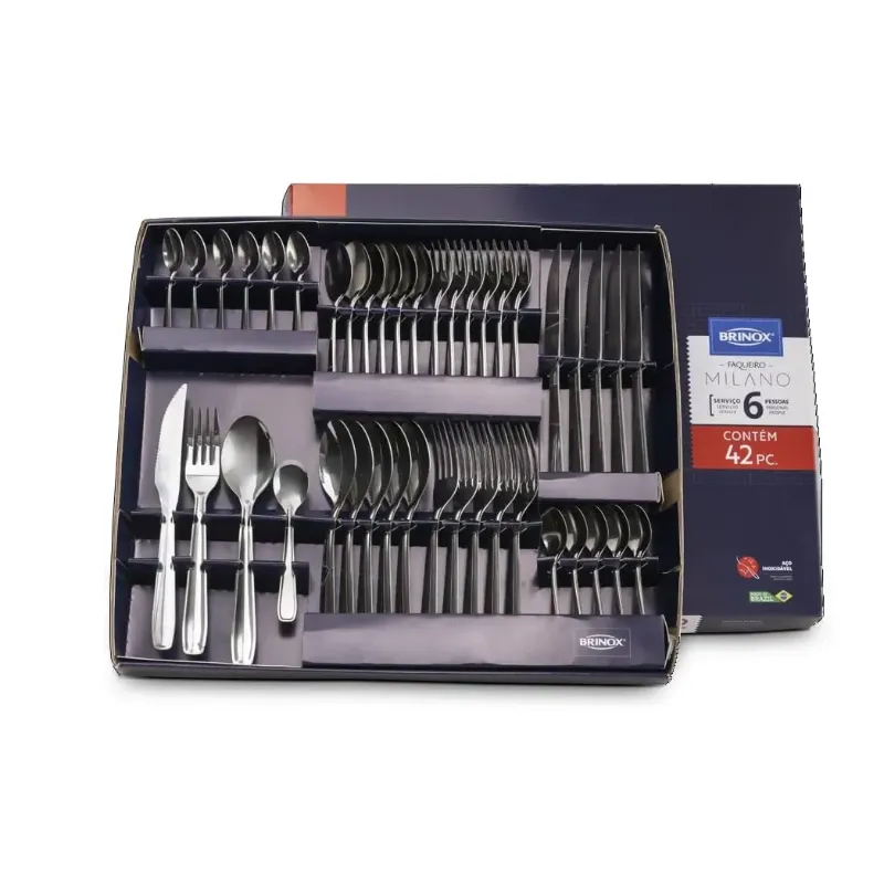 Praticidade em aço inoxidável do jogo de talheres 42 peças Milano Brinox, serve 6 pessoas com colheres, garfos, facas de churrasco, colheres de sobremesa, chá e café e garfos para torta. Versátil, os talheres inox Milano Brinox são compostos por 6 peças de cada talher e vai bem tanto em encontros formais quanto nos momentos de descontração. E após o uso, para facilitar a limpeza, os talheres podem ser levados a um lava-louça. Outro diferencial do jogo de talheres 42 peças Milano Brinox é que ele é totalmente feito em aço inox com polimento extra brilho que confere ao produto maior durabilidade, firmeza e beleza, quando dispostos a mesa. Produzido no Brasil com tecnologia nacional, o jogo de talheres 42 peças Milano Brinox combina perfeitamente com produtos que deixarão as suas gavetas ainda mais charmosas e organizadas, como por exemplo o Organizador de Talheres Perfect da Coza.