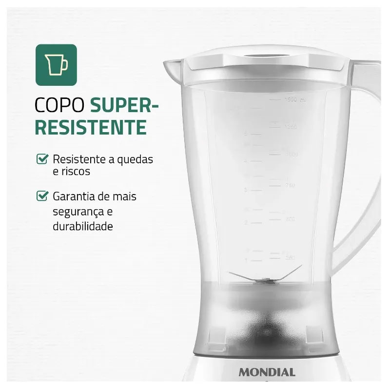 RESISTENTE A QUEDAS E RISCOS: O copo dos liquidificadores Mondial é super-resistente e garante mais durabilidade para seu aparelho.