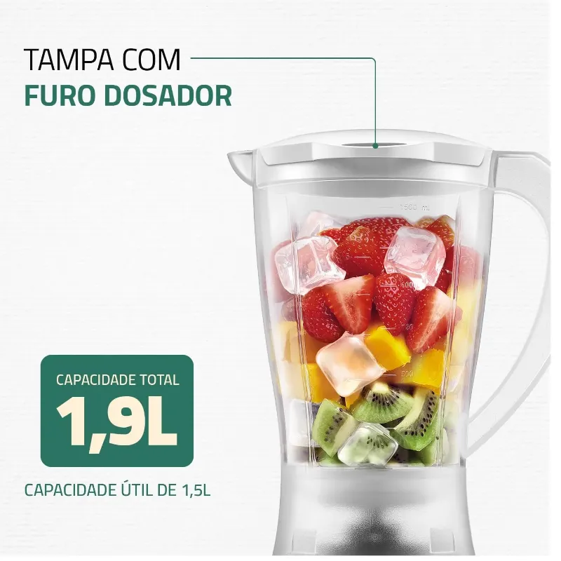 CAPACIDADE* TOTAL: 1,9 LITROS: Prepare sucos, vitaminas, smoothies, molhos e diversos outros pratos na porção ideal que você precisa! *Capacidade Útil de 1,5 Litros.