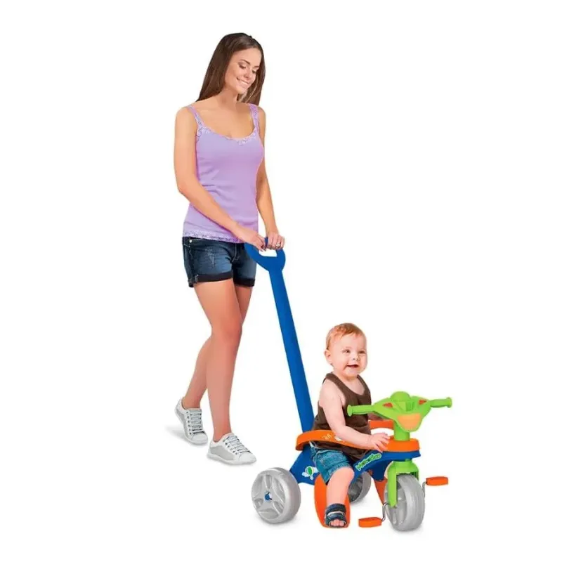 FUNÇÃO PASSEIO O adulto utiliza a haste (não direcionável) para conduzir o triciclo. FUNÇÃO PEDAL: Permite à criança brincar livremente como um triciclo convencional. Apoio removível mantém os pés da criança apoiados confortávelmente. Haste removível. Assento anatômico confortável com baixa distância do solo e altura ideal para a criança subir e descer de forma fácil e segura. Cercado de proteção removível. Novo sistema de rodas, praticidade na montagem. Idade: +12 meses. Peso máximo suportado: 19kg CE-BRI/INNAC-00143-01A
