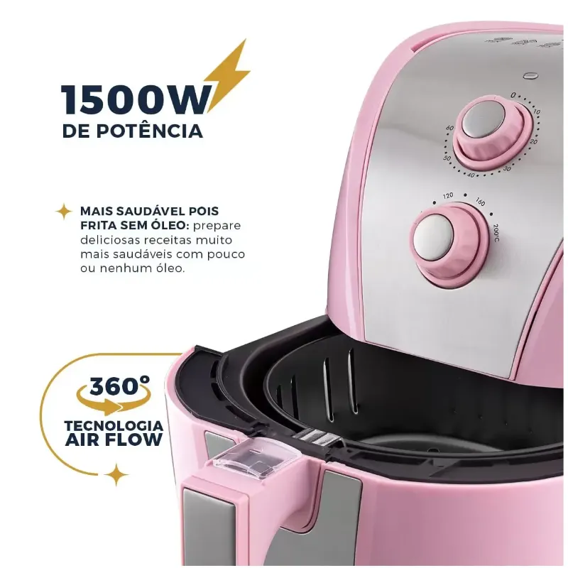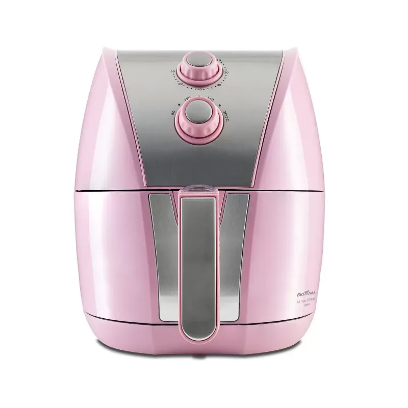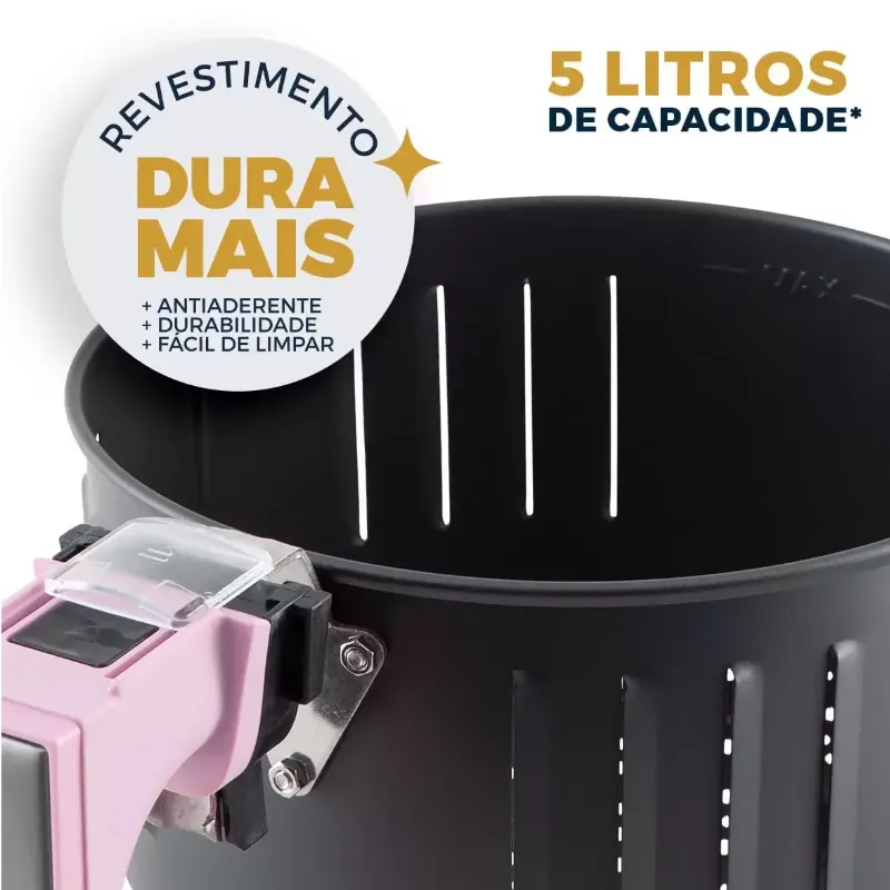 Ideal para quem tem fome e não quer passar muito tempo na cozinha. A Fritadeira Air Fryer Britânia BFR40RS Antiaderente 5L 1500W garante receitas saborosas de maneira rápida, prática e saudável. Isso porque ela conta com 1500W de potência e cesto com capacidade para 4,35 litros, perfeita para preparar desde os alimentos simples aos mais elaborados. Seu antiaderente Dura Mais não deixa os alimentos grudarem na superfície do cesto, além de facilitar a limpeza. Sem falar que a Fritadeira Air Fryer Britânia BFR40RS é a melhor escolha para quem ama a cor rosa e quer dar aquele charme especial na cozinha. • Frita com pouquíssimo ou nenhum óleo • Seletor de temperatura com ajuste de 80 a 200°C • Timer de 60 minutos • Capacidade do cesto 4,35l • Capacidade da cuba de 5 litros • Luzes indicadoras de funcionamento - laranja • Base antiderrapante • Cesto com formato quadrado • Cesto removível com revestimento antiaderente • Trava de segurança • Sistema de proteção contra superaquecimento • Acabamento frontal em inox • Fritadeira na cor Rosa • Composição: Metal e Plástico