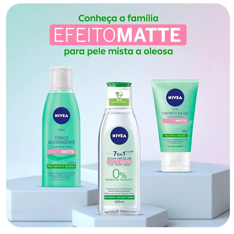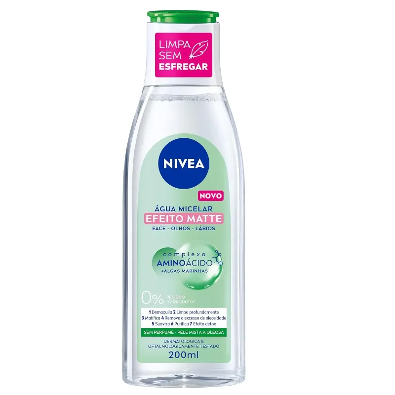 O que é? NIVEA Água Micelar Solução de Limpeza Facial 7 em 1 Efeito Matte é uma solução de limpeza que retira todas as impurezas da pele, inclusive resíduos de maquiagem.Para que serve?Com complexo de aminoácidos e algas marinhas em sua fórmula, NIVEA Água Micelar Solução de Limpeza 7 em 1 Efeito Matte demaquila, limpa profundamente, matifica, remove o excesso de oleosidade, suaviza, purifica e promove efeito detox.Pode ser usado diariamente para retirar a maquiagem e fazer a limpeza das impurezas. Dermatologicamente e oftalmologicamente testado, é indicado para a pele do rosto, lábios e região dos olhos, não sendo necessário enxaguar.